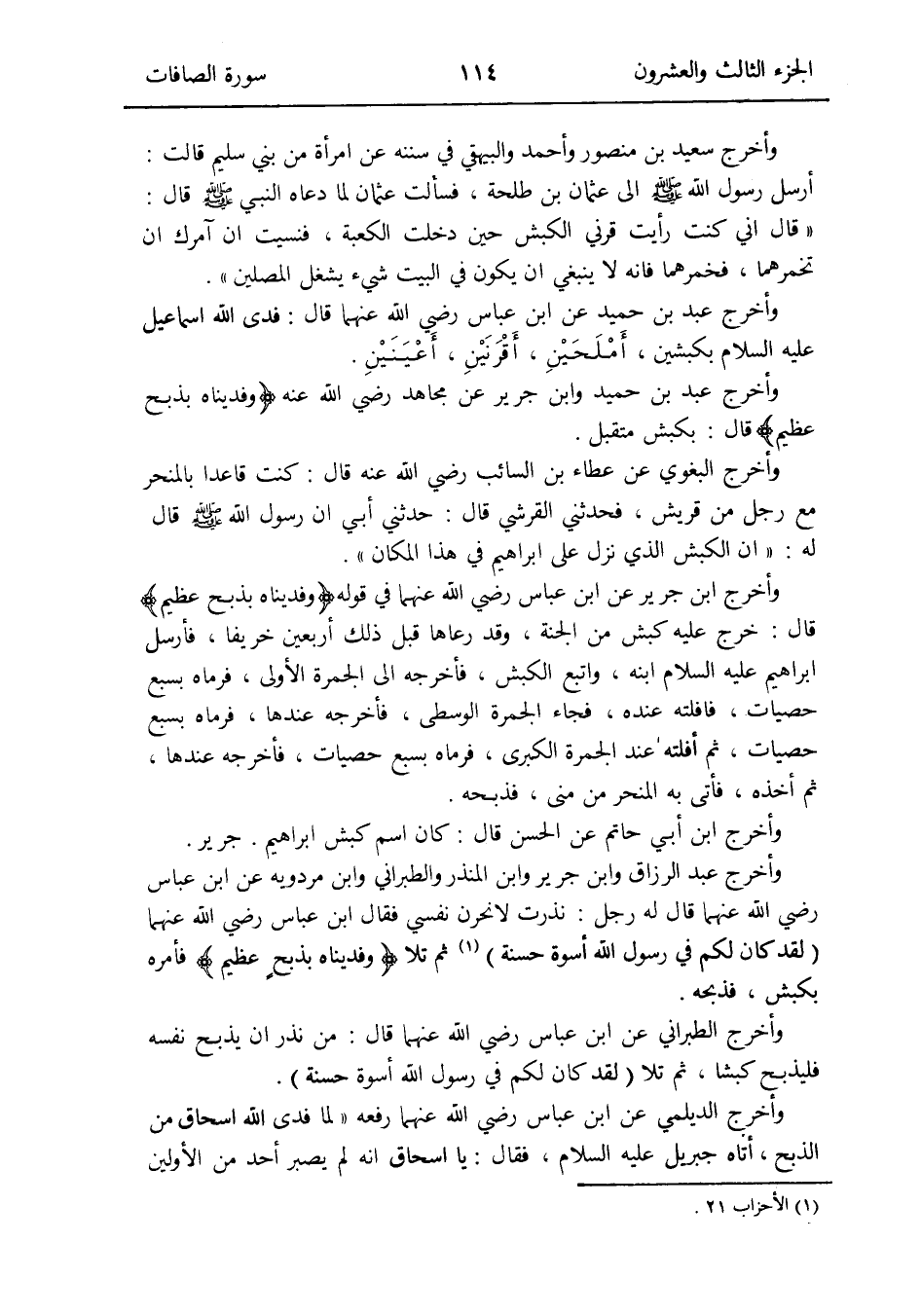 وَأخرج عبد الرَّزَّاق وَابْن جرير وَابْن الْمُنْذر وَالطَّبَرَانِيّ وَابْن مرْدَوَيْه عَن ابْن عَبَّاس رَضِي الله عَنْهُمَا قَالَ لَهُ رجل: نذرت لأنحرن نَفسِي فَقَالَ ابْن عَبَّاس رَضِي الله عَنْهُمَا (لقد كَانَ لكم فِي رَسُول الله أُسْوَة حَسَنَة) (الْأَحْزَاب 21) ثمَّ تَلا {وفديناه بذبحٍ عَظِيم} فَأمره بكبش فذبحه