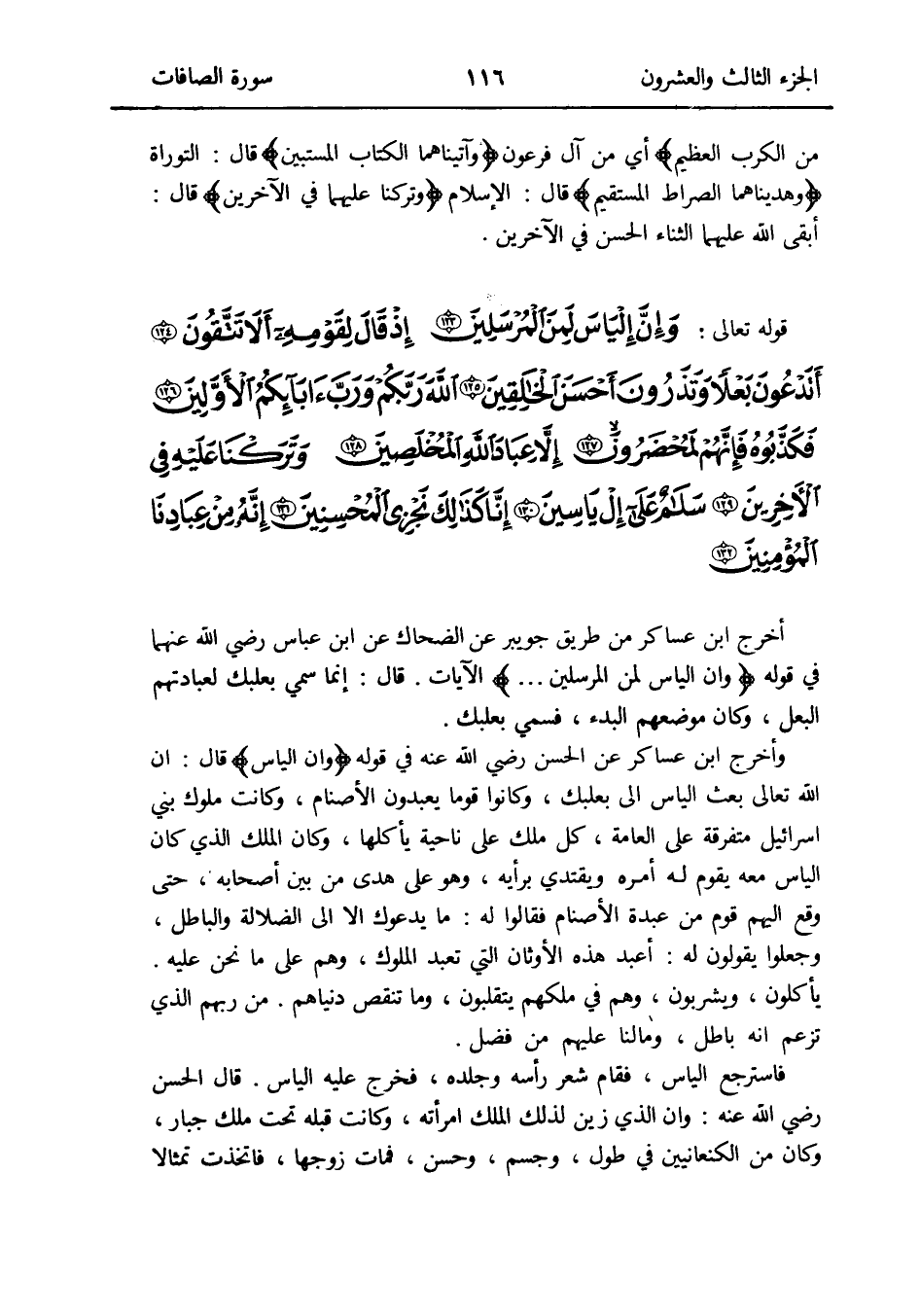 وَأخرج ابْن عَسَاكِر عَن الْحسن رَضِي الله عَنهُ فِي قَوْله {وَإِن إلْيَاس} قَالَ: إِن الله تَعَالَى بعث إلْيَاس إِلَى بعلبك وَكَانُوا قوما يعْبدُونَ الْأَصْنَام وَكَانَت مُلُوك بني إِسْرَائِيل مُتَفَرِّقَة على الْعَامَّة كل ملك على نَاحيَة يأكلها وَكَانَ الْملك الَّذِي كَانَ إلْيَاس مَعَه يقوم لَهُ أمره ويقتدي بِرَأْيهِ وَهُوَ على هدي من بَين أَصْحَابه حَتَّى وَقع إِلَيْهِم قوم من عَبدة الْأَصْنَام فَقَالُوا لَهُ: مَا يَدْعُوك إِلَّا إِلَى الضَّلَالَة وَالْبَاطِل وَجعلُوا يَقُولُونَ لَهُ: أعبد هَذِه الْأَوْثَان الَّتِي تعبد الْمُلُوك وهم على مَا نَحن عَلَيْهِ