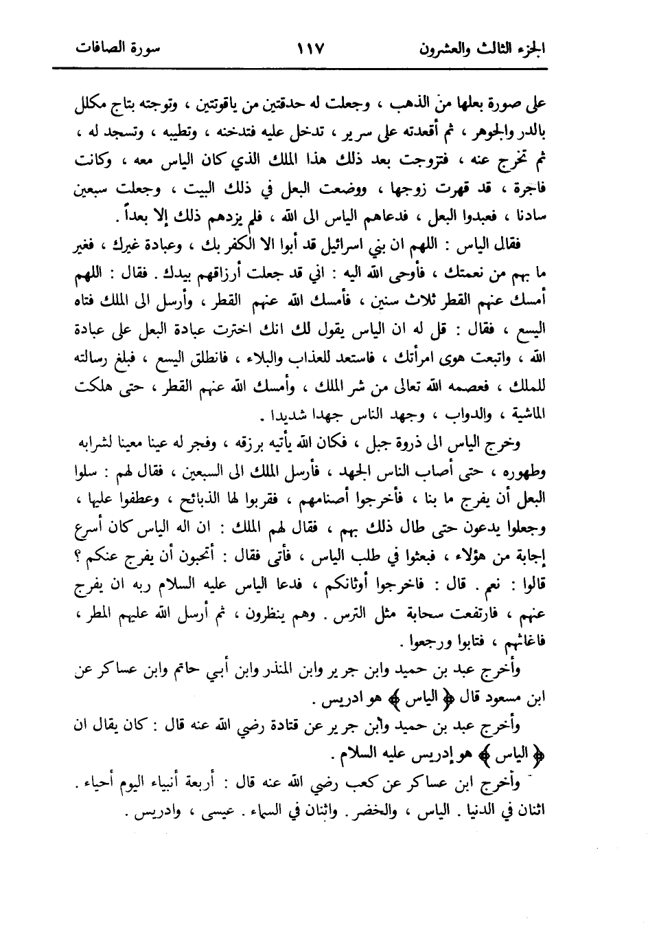 على صُورَة بَعْلهَا من الذَّهَب وَجعلت لَهُ حدقتين من ياقوتتين وتوجته بتاج مكلل بالدر والجوهر ثمَّ أقعدته على سَرِير تدخل عَلَيْهِ فتدخنه وتطيبه وتسجد لَهُ ثمَّ تخرج عَنهُ فَتزوّجت بعد ذَلِك هَذَا الْملك الَّذِي كَانَ إلْيَاس مَعَه وَكَانَت فاجرة قد قهرت زَوجهَا وَوضعت البعل فِي ذَلِك الْبَيْت وَجعلت سبعين سادنا فعبدوا البعل فَدَعَاهُمْ إلْيَاس إِلَى الله فَلم يزدهم ذَلِك إِلَّا بعدا