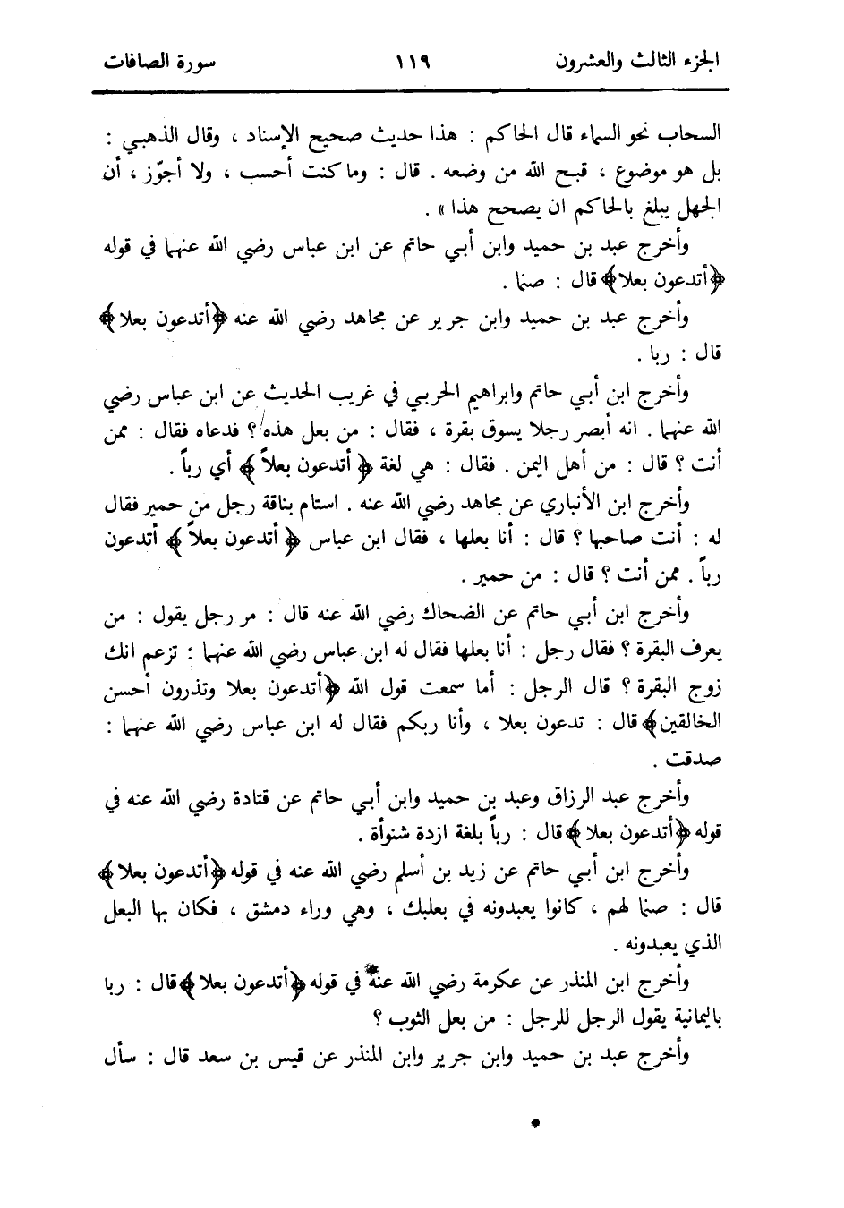 وَأخرج عبد بن حميد وَابْن أبي حَاتِم عَن ابْن عَبَّاس رَضِي الله عَنْهُمَا فِي قَوْله {أَتَدعُونَ بعلاً} قَالَ: صنماً