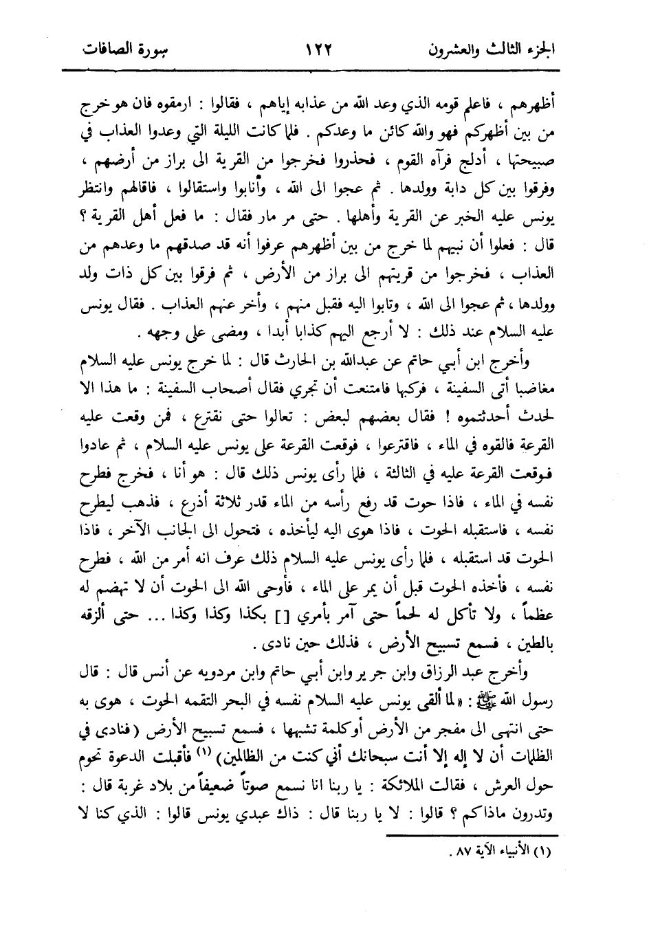 وَأخرج ابْن أبي حَاتِم عَن عبد الله بن الْحَارِث قَالَ: لما خرج يُونُس عَلَيْهِ السَّلَام مغاضباً أَتَى السَّفِينَة فركبها فامتنعت أَن تجْرِي فَقَالَ أَصْحَاب السَّفِينَة: مَا هَذَا إِلَّا لحَدث أحدثتموه فَقَالَ بَعضهم لبَعض: تَعَالَوْا حَتَّى نقترع فَمن وَقعت عَلَيْهِ الْقرعَة فالقوه فِي المَاء فاقترعوا فَوَقَعت الْقرعَة على يُونُس عَلَيْهِ السَّلَام ثمَّ عَادوا فَوَقَعت الْقرعَة عَلَيْهِ فِي الثَّالِثَة فَلَمَّا رأى يُونُس ذَلِك قَالَ: هُوَ أَنا فَخرج فَطرح نَفسه فَإِذا حوت قد رفع رَأسه من المَاء قدر ثَلَاثَة أَذْرع فَذهب لِيطْرَح نَفسه فَاسْتَقْبلهُ الْحُوت فَإِذا هوى إِلَيْهِ ليأخذه فتحول إِلَى الْجَانِب الآخر فَإِذا الْحُوت قد استقبله فَلَمَّا رأى يُونُس عَلَيْهِ السَّلَام ذَلِك عرف أَنه أَمر من الله فَطرح نَفسه فَأَخذه الْحُوت قبل أَن يمر على المَاء فَأوحى الله إِلَى الْحُوت أَن لَا تهضم لَهُ عظما وَلَا تَأْكُل لَهُ لَحْمًا حَتَّى آمُر بأَمْري [] بِكَذَا وَكَذَا وَكَذَا