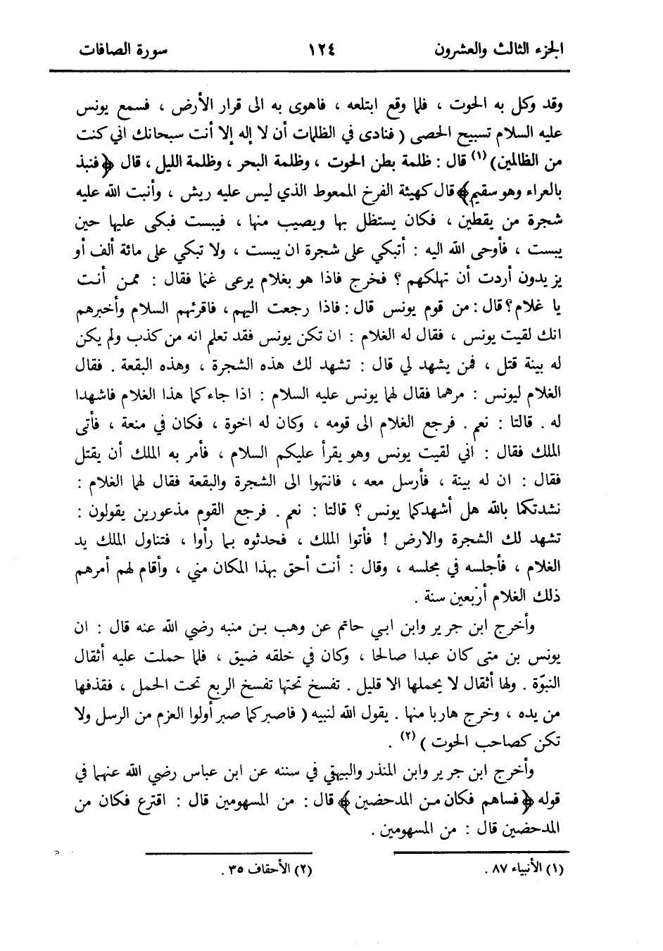 وَقد وكل بِهِ الْحُوت فَلَمَّا وَقع ابتلعه فَأَهوى بِهِ إِلَى قَرَار الأَرْض فَسمع يُونُس عَلَيْهِ السَّلَام تَسْبِيح الْحَصَى (فَنَادَى فِي الظُّلُمَات أَن لَا إِلَه إِلَّا أَنْت سُبْحَانَكَ إِنِّي كنت من الظَّالِمين) (الْأَنْبِيَاء 87) قَالَ: ظلمَة بطن الْحُوت وظلمة الْبَحْر وظلمة اللَّيْل قَالَ {فنبذناه بالعراء وَهُوَ سقيم} قَالَ كَهَيئَةِ الفرخ الممعوط الَّذِي لَيْسَ عَلَيْهِ ريش وَأنْبت الله عَلَيْهِ شَجَرَة من يَقْطِين فَكَانَ يستظل بهَا ويصيب مِنْهَا فيبست فَبكى عَلَيْهَا حِين يَبِسَتْ فَأوحى الله إِلَيْهِ: أَتَبْكِي على شَجَرَة أَن يَبِسَتْ وَلَا تبْكي على مائَة ألف أَو يزِيدُونَ أردْت أَن تهلكهم فَخرج فَإِذا هُوَ بِغُلَام يرْعَى غنما فَقَالَ: مِمَّن أَنْت يَا غُلَام قَالَ: من قوم يُونُس قَالَ: فَإِذا رجعت إِلَيْهِم فاقرئهم السَّلَام وَأخْبرهمْ إِنَّك لقِيت يُونُس فَقَالَ لَهُ الْغُلَام: إِن تكن يُونُس فقد تعلم أَنه من كذب وَلم يكن لَهُ بَيِّنَة قتل فَمن يشْهد لي قَالَ: تشهد لَك هَذِه الشَّجَرَة وَهَذِه الْبقْعَة