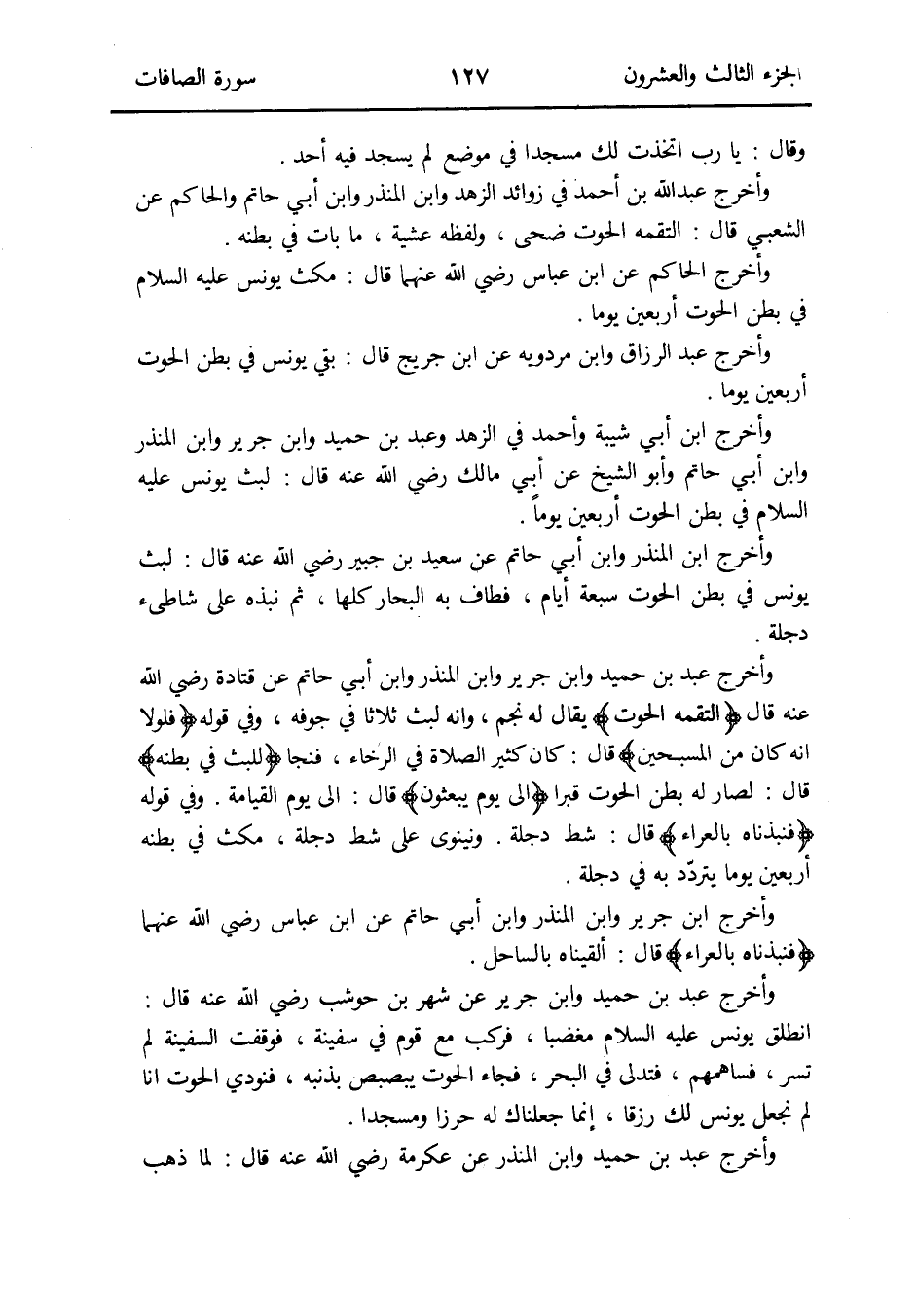 وَأخرج ابْن الْمُنْذر وَابْن أبي حَاتِم عَن سعيد بن جُبَير رَضِي الله عَنهُ قَالَ: لبث يُونُس فِي بطن الْحُوت سَبْعَة أَيَّام فَطَافَ بِهِ الْبحار كلهَا ثمَّ نبذه على شاطىء دجلة