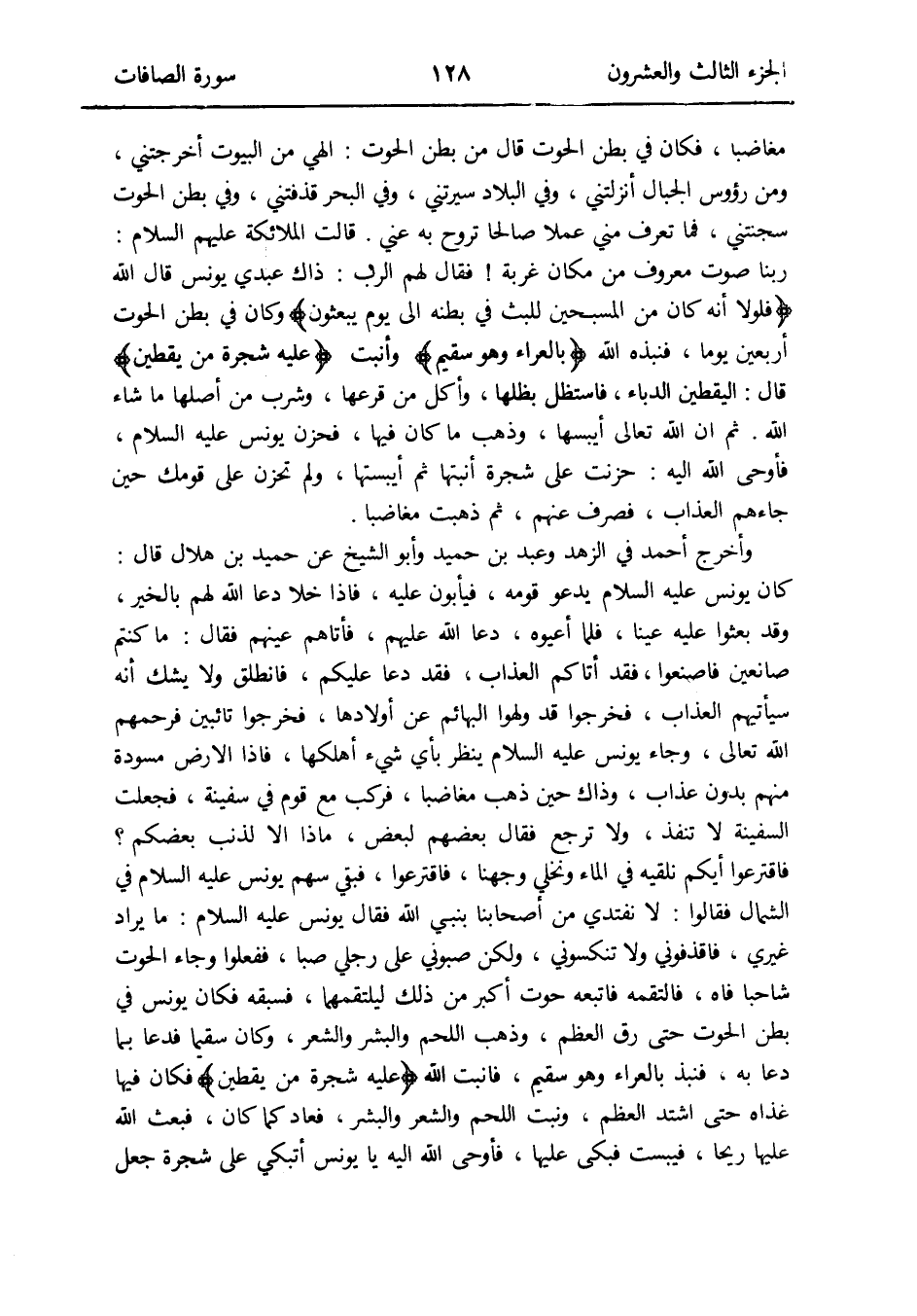 وَأخرج أَحْمد فِي الزّهْد وَعبد بن حميد وَأَبُو الشَّيْخ عَن حميد بن هِلَال قَالَ: كَانَ يُونُس عَلَيْهِ السَّلَام يَدْعُو قومه فيأبون عَلَيْهِ فَإِذا خلا دَعَا الله لَهُم بِالْخَيرِ وَقد بعثوا عَلَيْهِ عينا فَلَمَّا أعيوه دَعَا الله عَلَيْهِم فَأَتَاهُم عينهم فَقَالَ: مَا كُنْتُم صانعين فَاصْنَعُوا فقد أَتَاكُم الْعَذَاب فقد دَعَا عَلَيْكُم فَانْطَلق وَلَا يشك أَنه يسأتيهم الْعَذَاب فَخَرجُوا قد ولهوا الْبَهَائِم عَن أَوْلَادهَا فَخَرجُوا تَائِبين فَرَحِمهمْ الله تَعَالَى وَجَاء يُونُس عَلَيْهِ السَّلَام ينظر بِأَيّ شَيْء أهلكها فَإِذا الأَرْض مسودة مِنْهُم بِدُونِ عَذَاب وَذَاكَ حِين ذهب مغاضباً فَركب مَعَ قوم فِي سفينة فَجعلت السَّفِينَة لَا تنفذ وَلَا ترجع فَقَالَ بَعضهم لبَعض مَاذَا إِلَّا لذنب بَعْضكُم فاقترعوا أَيّكُم نلقيه فِي المَاء ونخلي وجهنا فاقترعوا فَبَقيَ سهم يُونُس عَلَيْهِ السَّلَام فِي الشمَال فَقَالُوا: لَا نفتدي من أَصْحَابنَا بِنَبِي الله فَقَالَ يُونُس عَلَيْهِ السَّلَام: مَا يُرَاد غَيْرِي فاقذفوني وَلَا تنكسوني وَلَكِن صبوني على رجْلي صبا فَفَعَلُوا وَجَاء الْحُوت شاحباً فَاه فالتقمه فَاتبعهُ حوت أكبر من ذَلِك ليلتقمهما فسبقه فَكَانَ يُونُس فِي بطن الْحُوت حَتَّى رق الْعظم وَذهب اللَّحْم والبشر وَالشعر وَكَانَ سقيماً فَدَعَا بِمَا دَعَا بِهِ فنبذ بالعراء وَهُوَ سقيم فأنبت الله {عَلَيْهِ شَجَرَة من يَقْطِين} فَكَانَ فِيهَا غذاه حَتَّى اشْتَدَّ الْعظم وَنبت اللَّحْم وَالشعر والبشر فَعَاد كَمَا كَانَ فَبعث الله عَلَيْهَا ريحًا فيبست فَبكى عَلَيْهَا فَأوحى الله إِلَيْهِ يَا يُونُس أَتَبْكِي على شَجَرَة جعل