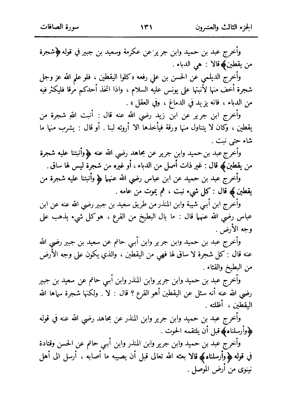 وَأخرج عبد بن حميد عَن ابْن عَبَّاس رَضِي الله عَنْهُمَا {وأنبتنا عَلَيْهِ شَجَرَة من يَقْطِين} قَالَ: كل شَيْء نبت ثمَّ يَمُوت من عَامه