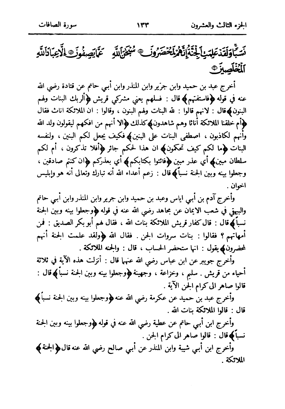 أخرج عبد بن حميد وَابْن جرير وَابْن الْمُنْذر وَابْن أبي حَاتِم عَن قَتَادَة رَضِي الله عَنهُ فِي قَوْله {فاستفتهم} قَالَ: فسلهم يَعْنِي مُشْركي قُرَيْش {ألربك الْبَنَات وَلَهُم البنون} قَالَ: لأَنهم قَالُوا: لله الْبَنَات وَلَهُم البنون وَقَالُوا: إِن الْمَلَائِكَة أناث فَقَالَ {أم خلقنَا الْمَلَائِكَة أناثاً وهم شاهدون} كَذَلِك {أَلا إِنَّهُم من إفكهم ليقولون ولد الله وَإِنَّهُم لَكَاذِبُونَ اصْطفى الْبَنَات على الْبَنِينَ} فَكيف يَجْعَل لكم الْبَنِينَ ولنفسه الْبَنَات {مَا لكم كَيفَ تحكمون} إِن هَذَا لحكم جَائِر {أَفلا تذكرُونَ أم لكم سُلْطَان مُبين} أَي عذر مُبين {فَأتوا بِكِتَابِكُمْ} أَي بعذركم {إِن كُنْتُم صَادِقين وَجعلُوا بَينه وَبَين الْجنَّة نسبا} قَالَ: زعم أَعدَاء الله أَنه تبَارك وَتَعَالَى أَنه هُوَ وإبليس أَخَوان