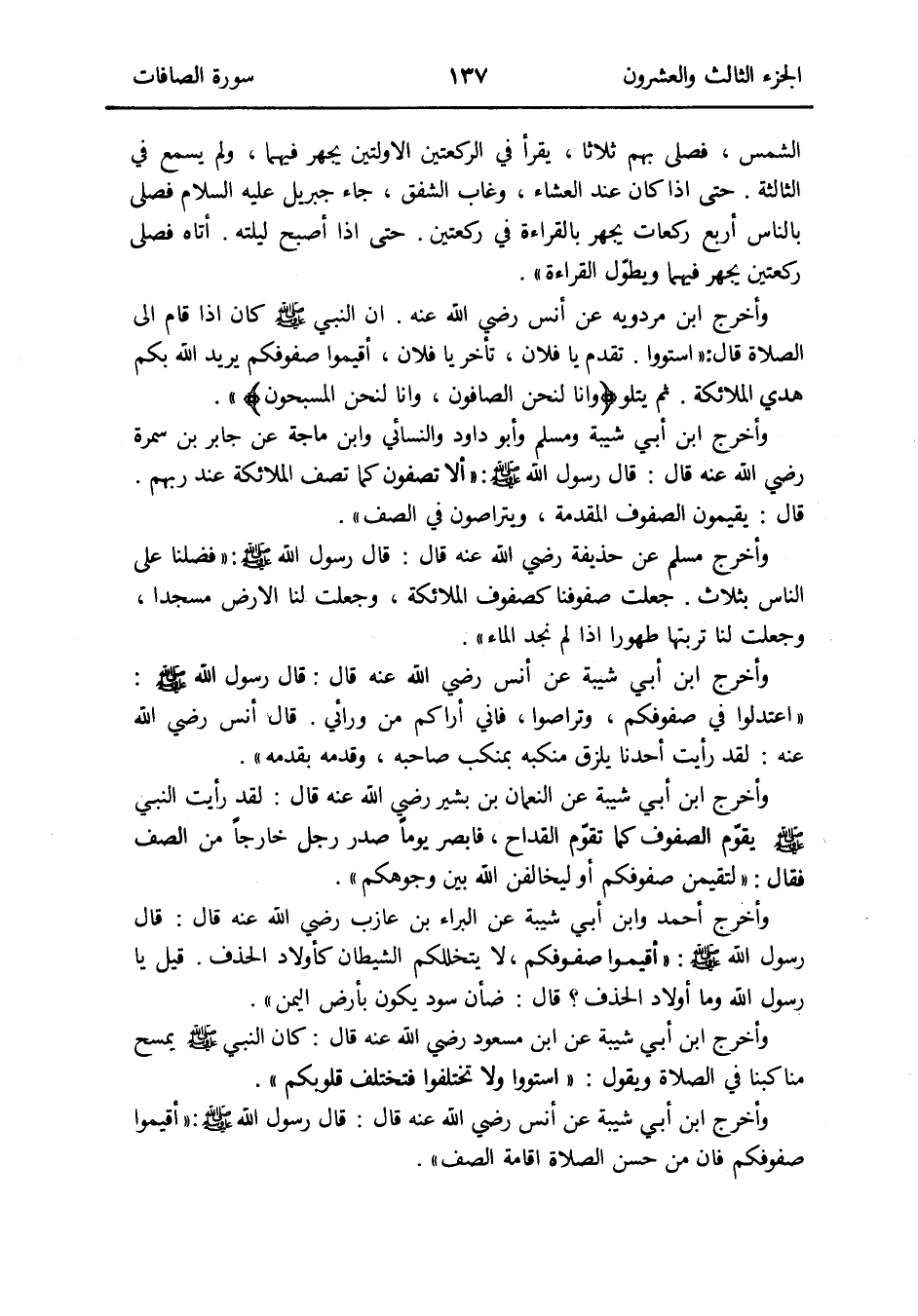وَأخرج ابْن أبي شيبَة عَن أنس رَضِي الله عَنهُ قَالَ: قَالَ رَسُول الله صلى الله عَلَيْهِ وَسلم: أقِيمُوا صفوفكم فَإِن من حسن الصَّلَاة إِقَامَة الصَّفّ