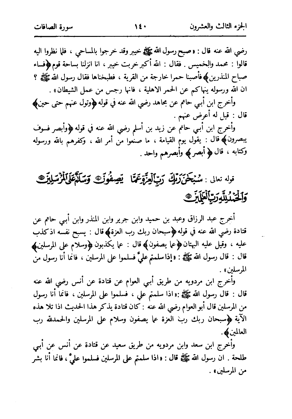 أخرج عبد الرَّزَّاق وَعبد بن حميد وَابْن جرير وَابْن الْمُنْذر وَابْن أبي حَاتِم عَن قَتَادَة رَضِي الله عَنهُ فِي قَوْله {سُبْحَانَ رَبك رب الْعِزَّة} قَالَ: يسبح نَفسه إِذْ كذب عَلَيْهِ وَقيل عَلَيْهِ الْبُهْتَان {عَمَّا يصفونَ} قَالَ: عَمَّا يكذبُون {وَسَلام على الْمُرْسلين} قَالَ: قَالَ رَسُول الله صلى الله عَلَيْهِ وَسلم: إِذا سلمتم عَليّ فَسَلمُوا على الْمُرْسلين فَإِنَّمَا أَنا رَسُول من الْمُرْسلين