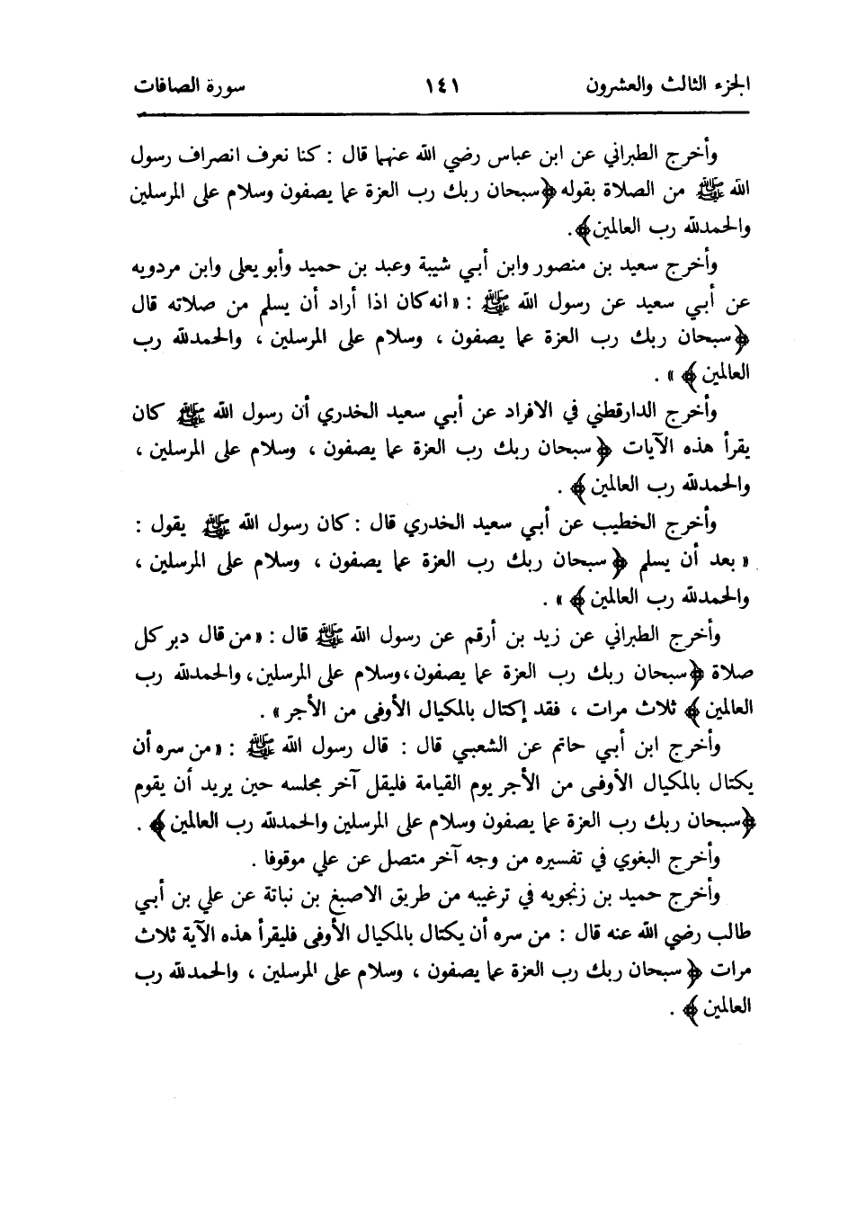 وَأخرج الطَّبَرَانِيّ عَن زيد بن أَرقم عَن رَسُول الله صلى الله عَلَيْهِ وَسلم قَالَ: من قَالَ دبر كل صَلَاة {سُبْحَانَ رَبك رب الْعِزَّة عَمَّا يصفونَ وَسَلام على الْمُرْسلين وَالْحَمْد لله رب الْعَالمين} ثَلَاث مَرَّات فقد اكتال بالمكيال الأوفى من الْأجر)