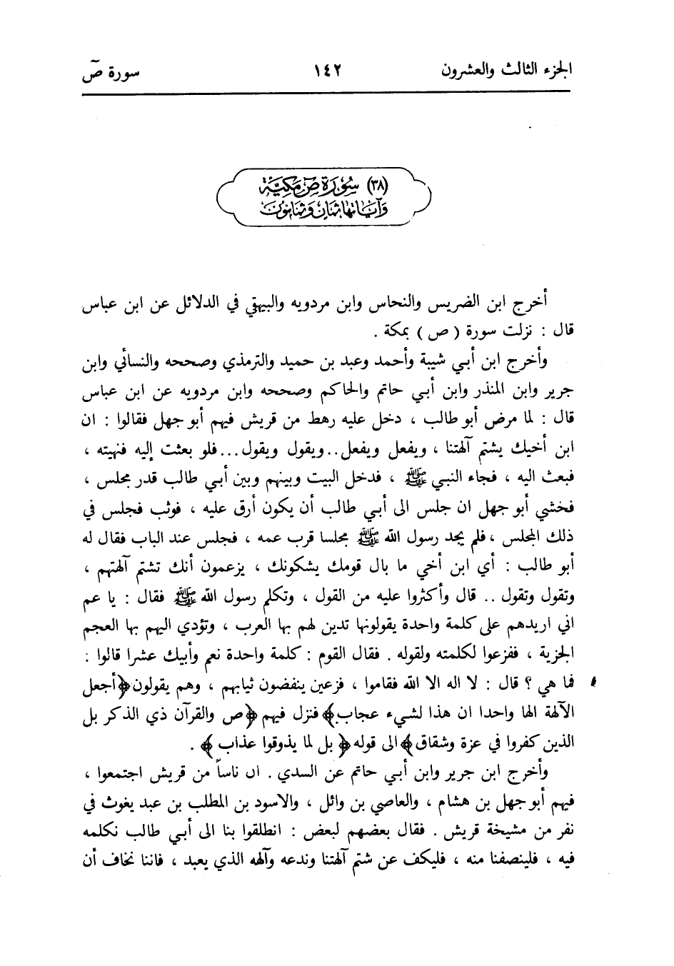 مُقَدّمَة سُورَة ص أخرج ابْن الضريس والنحاس وَابْن مرْدَوَيْه وَالْبَيْهَقِيّ فِي الدَّلَائِل عَن ابْن عَبَّاس قَالَ: نزلت سُورَة (ص) بِمَكَّة