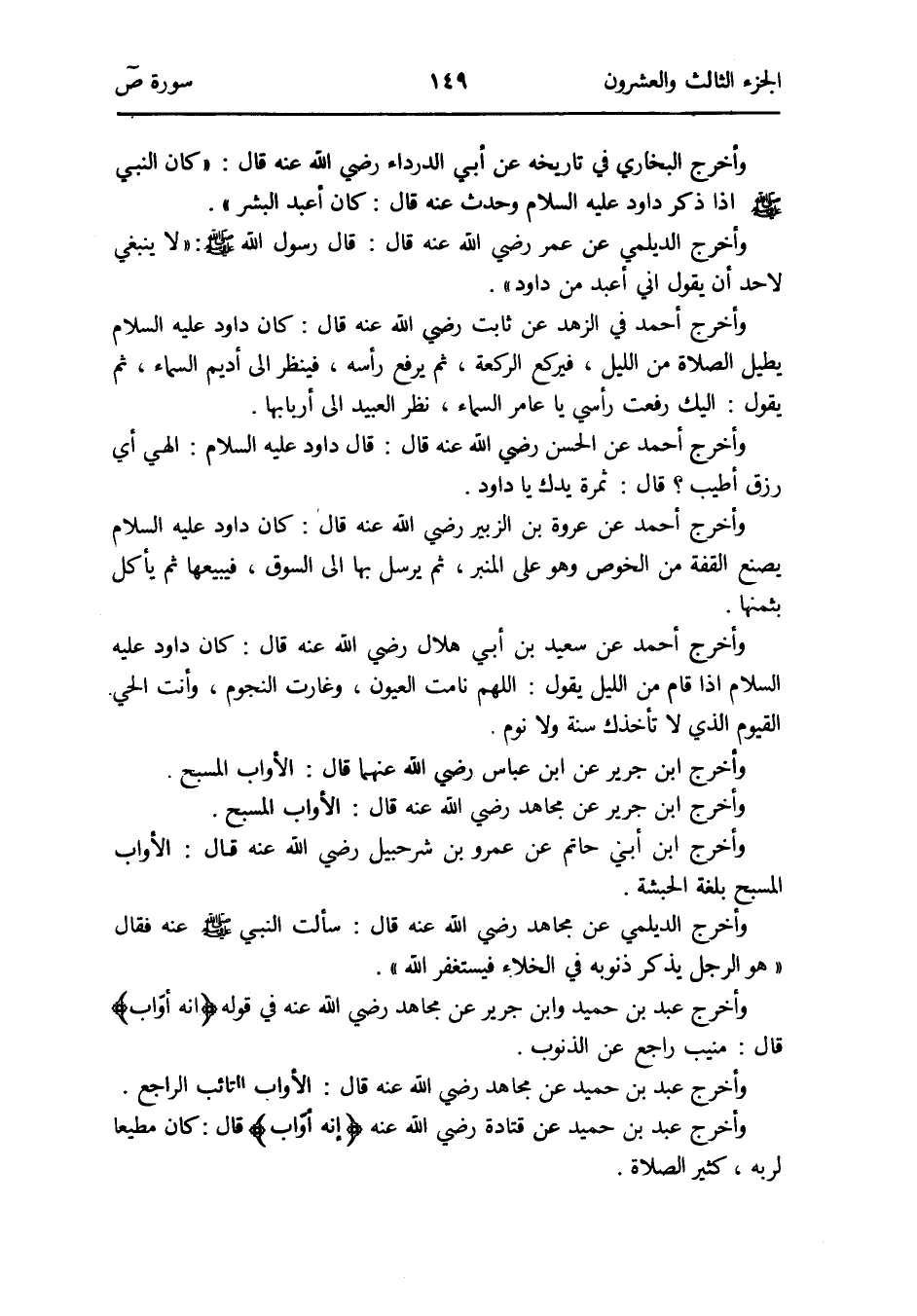 وَأخرج البُخَارِيّ فِي تَارِيخه عَن أبي الدَّرْدَاء رَضِي الله عَنهُ قَالَ: كَانَ النَّبِي صلى الله عَلَيْهِ وَسلم إِذا ذكر دَاوُد عَلَيْهِ السَّلَام وَحدث عَنهُ قَالَ: كَانَ أعبد الْبشر