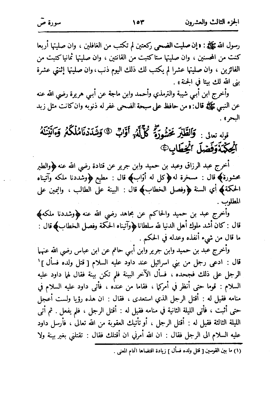 أخرج عبد الرَّزَّاق وَعبد بن حميد وَابْن جرير عَن قَتَادَة رَضِي الله عَنهُ {وَالطير محشورة} قَالَ: مسخرة لَهُ {كل لَهُ أوّاب} قَالَ: مُطِيع {وشددنا ملكه وَآتَيْنَاهُ الْحِكْمَة} أَي السّنة {وَفصل الْخطاب} قَالَ: الْبَيِّنَة على الطَّالِب وَالْيَمِين على الْمَطْلُوب