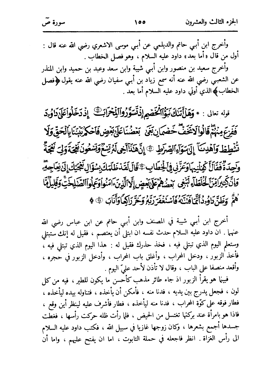 وَأخرج سعيد بن مَنْصُور وَابْن أبي شيبَة وَابْن سعد وَعبد بن حميد وَابْن الْمُنْذر عَن الشّعبِيّ رَضِي الله عَنهُ أَنه سمع زِيَاد بن أبي سُفْيَان رَضِي الله عَنهُ يَقُول {وَفصل الْخطاب} الَّذِي أُوتِيَ دَاوُد عَلَيْهِ السَّلَام أما بعد