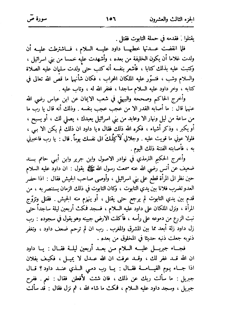 وَأخرج الْحَكِيم التِّرْمِذِيّ فِي نَوَادِر الْأُصُول وَابْن جرير وَابْن أبي حَاتِم بِسَنَد ضَعِيف عَن أنس رَضِي الله عَنهُ سَمِعت رَسُول الله صلى الله عَلَيْهِ وَسلم يَقُول: إِن دَاوُد عَلَيْهِ السَّلَام حِين نظر إِلَى الْمَرْأَة قطع على بني إِسْرَائِيل وَأوصى صَاحب الْجَيْش فَقَالَ: إِذا حضر الْعَدو تضرب فلَانا بَين يَدي التابوت وَكَانَ التابوت فِي ذَلِك الزَّمَان يستنصر بِهِ من قدم بَين يَدي التابوت لم يرجع حَتَّى يقتل أَو ينهزم مِنْهُ الْجَيْش