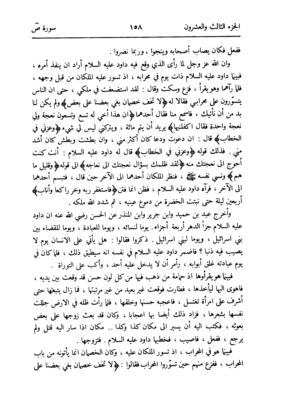 وَإِن الله عز وَجل لما رأى الَّذِي وَقع فِيهِ دَاوُد عَلَيْهِ السَّلَام أَرَادَ أَن ينفذ أمره فَبَيْنَمَا دَاوُد عَلَيْهِ السَّلَام ذَات يَوْم فِي محرابه إِذْ تسور عَلَيْهِ الْملكَانِ من قبل وَجهه فَلَمَّا رآهما وَهُوَ يقْرَأ فزع وَسكت وَقَالَ: لقد استضعفت فِي ملكي حَتَّى أَن النَّاس يتسوّرون على محرابي فَقَالَا لَهُ {لَا تخف خصمان بغى بَعْضنَا على بعض} وَلم يكن لنا بُد من أَن نَأْتِيك فاسمع منا فَقَالَ أَحدهمَا {إِن هَذَا أخي لَهُ تسع وَتسْعُونَ نعجة ولي نعجة وَاحِدَة فَقَالَ أكفلنيها} يُرِيد أَن يتم مائَة ويتركني لَيْسَ لي شَيْء {وعزني فِي الْخطاب} قَالَ: إِن دَعَوْت ودعا كَانَ أَكثر مني وَإِن بطشت وبطش كَانَ أَشد مني