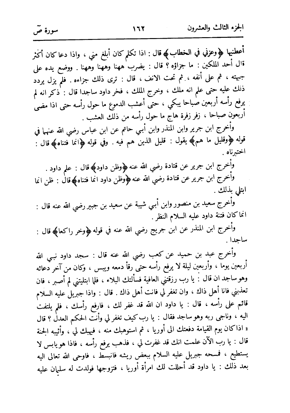 وَأخرج عبد بن حميد عَن كَعْب رَضِي الله عَنهُ قَالَ: سجد دَاوُد نَبِي الله أَرْبَعِينَ يَوْمًا وَأَرْبَعين لَيْلَة لَا يرفع رَأسه حَتَّى رقأ دمعه ويبس وَكَانَ من آخر دُعَائِهِ وَهُوَ ساجد أَن قَالَ: يَا رب رزقتني الْعَافِيَة فسألتك الْبلَاء فَلَمَّا ابتليتني لم أَصْبِر فَإِن تعذبني فَأَنا أهل ذَاك وَإِن تغْفر لي فانت أهل ذَاك