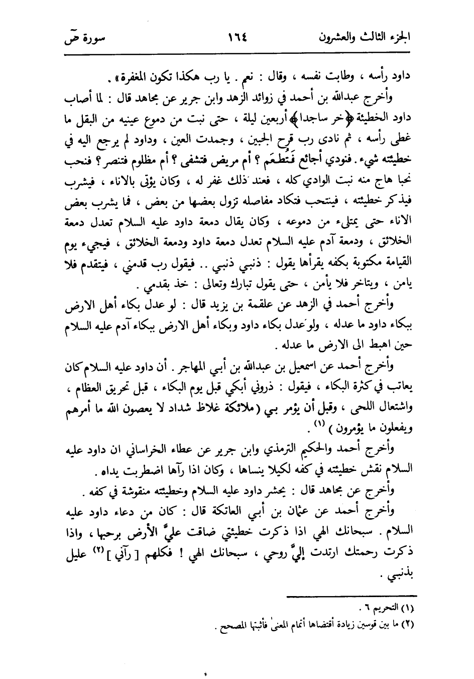 أَن دَاوُد عَلَيْهِ السَّلَام كَانَ يُعَاتب فِي كَثْرَة الْبكاء فَيَقُول: ذروني أبْكِي قبل يَوْم الْبكاء قبل تحريق الْعِظَام واشتعال اللحى وَقبل أَن يُؤمر بِي (مَلَائِكَة غِلَاظ شَدَّاد لَا يعصون الله مَا أَمرهم ويفعلون مَا يؤمرون) (التَّحْرِيم 6)