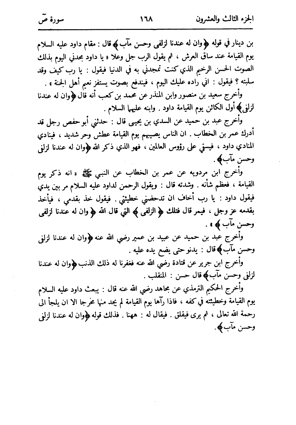 بن دِينَار فِي قَوْله {وَإِن لَهُ عندنَا لزلفى وَحسن مآب} قَالَ: مقَام دَاوُد عَلَيْهِ السَّلَام يَوْم الْقِيَامَة عِنْد سَاق الْعَرْش ثمَّ يَقُول الرب جلّ وَعلا يَا دَاوُد مجدني الْيَوْم بذلك الصَّوْت الْحسن الرخيم الَّذِي كنت تمجدني بِهِ فِي الدُّنْيَا فَيَقُول: يَا رب كَيفَ وَقد سلبته فَيَقُول: إِنِّي راده عَلَيْك الْيَوْم فيندفع بِصَوْت يستفز نعيم أهل الْجنَّة
