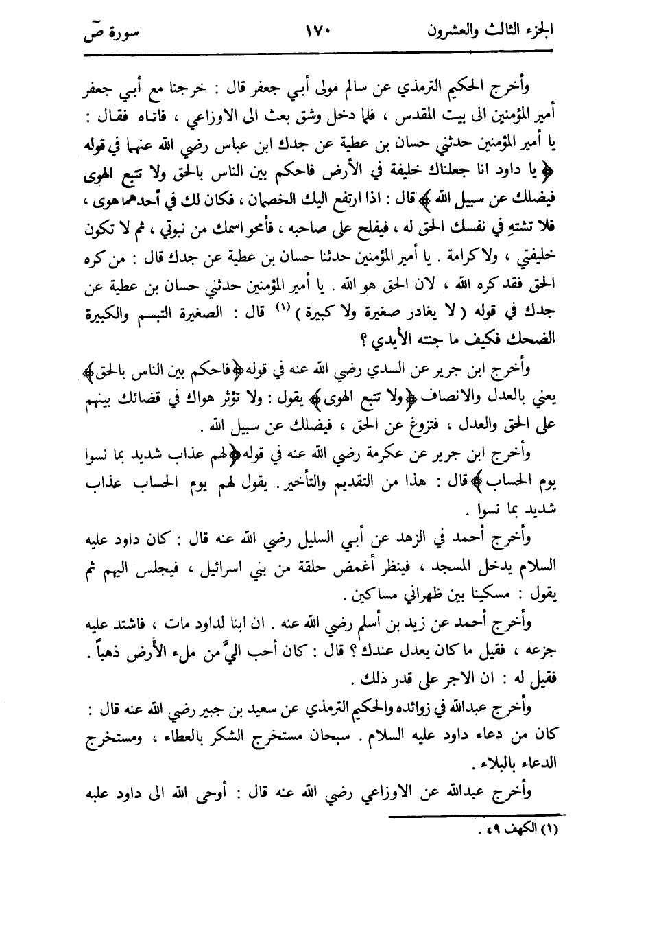 يَا أَمِير الْمُؤمنِينَ حَدثنِي حسان بن عَطِيَّة عَن جدك فِي قَوْله (لَا يُغَادر صَغِيرَة وَلَا كَبِيرَة) (الْكَهْف 49) قَالَ: الصَّغِيرَة التبسم والكبيرة الضحك فَكيف مَا جنته الْأَيْدِي وَأخرج ابْن جرير عَن السّديّ رَضِي الله عَنهُ فِي قَوْله {فاحكم بَين النَّاس بِالْحَقِّ} يَعْنِي بِالْعَدْلِ والانصاف {وَلَا تتبع الْهوى} يَقُول: وَلَا تُؤثر هَوَاك فِي قضائك بَينهم على الْحق وَالْعدْل فتزوغ عَن الْحق فيضلك عَن سَبِيل الله