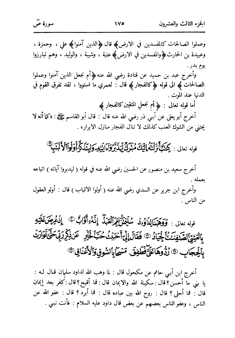 أخرج سعيد بن مَنْصُور عَن الْحُسَيْن رَضِي الله عَنهُ فِي قَوْله {ليدبروا آيَاته} اتِّبَاعه بِعَمَلِهِ