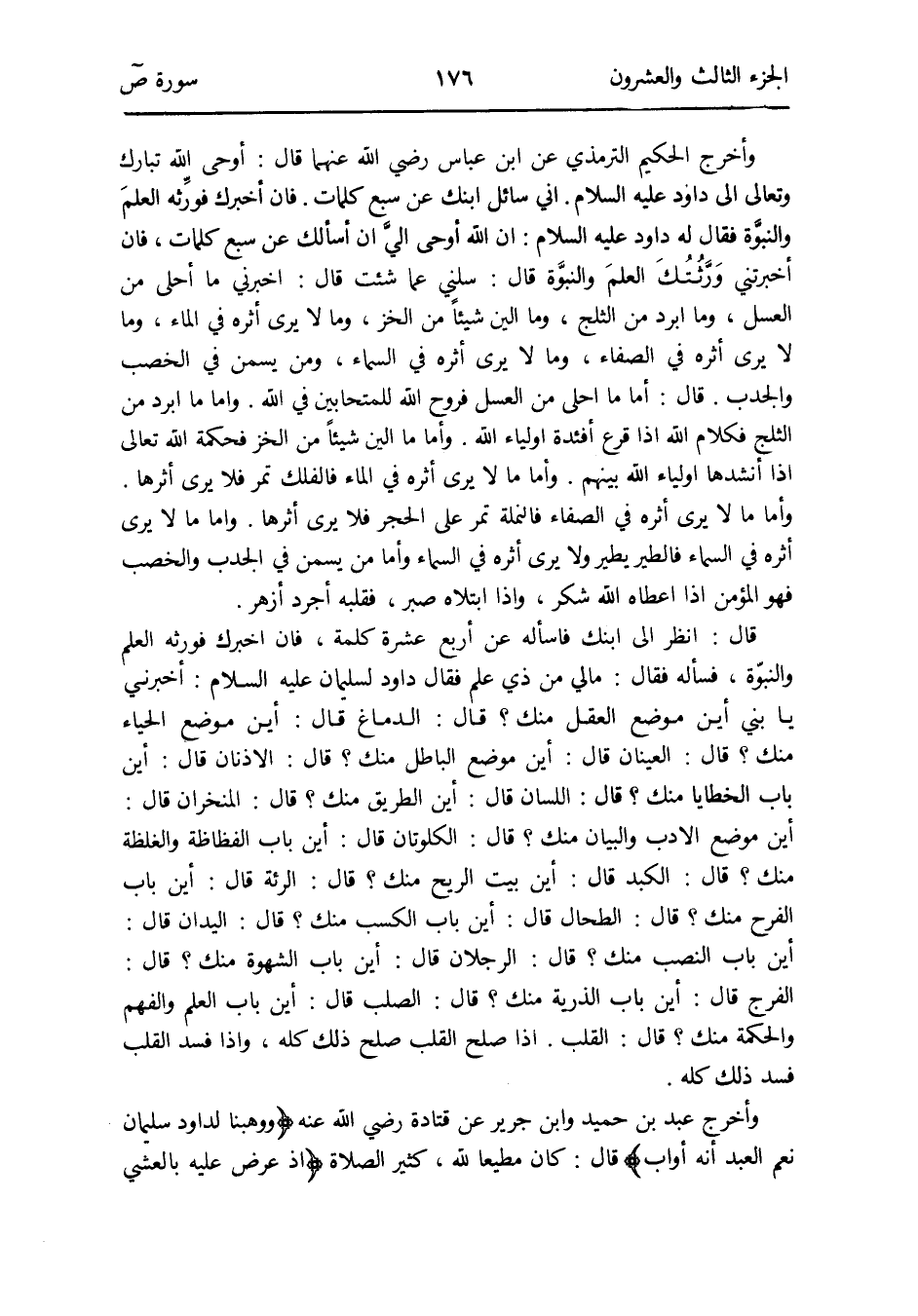 قَالَ: انْظُر إِلَى ابْنك فَاسْأَلْهُ عَن أَربع عشرَة كلمة فَإِن أخْبرك فورثه الْعلم والنبوّة فَسَأَلَهُ فَقَالَ: مَا لي من ذِي علم فَقَالَ دَاوُد لِسُلَيْمَان عَلَيْهِ السَّلَام: أَخْبرنِي يَا بني أَيْن مَوضِع الْعقل مِنْك قَالَ: الدِّمَاغ قَالَ: أَيْن مَوضِع الْحيَاء مِنْك قَالَ: العينان قَالَ: أَيْن مَوضِع الْبَاطِل مِنْك قَالَ: الأذنان قَالَ: أَيْن بَاب الْخَطَايَا مِنْك قَالَ: اللِّسَان قَالَ: أَيْن الطَّرِيق مِنْك قَالَ: المنخران قَالَ: أَيْن مَوضِع الْأَدَب وَالْبَيَان مِنْك قَالَ: الكلوتان قَالَ: أَيْن بَاب الفظاظة والغلظة مِنْك قَالَ: الكبد قَالَ: أَيْن بَيت الرّيح مِنْك قَالَ: الرئة قَالَ: أَيْن بَاب الْفَرح مِنْك قَالَ: الطحال قَالَ: أَيْن بَاب الْكسْب مِنْك قَالَ: اليدان قَالَ: أَيْن بَاب النصب مِنْك قَالَ: الرّجلَانِ قَالَ: أَيْن بَاب الشَّهْوَة مِنْك قَالَ: الْفرج قَالَ: أَيْن بَاب الذُّرِّيَّة مِنْك قَالَ: الصلب قَالَ: أَيْن بَاب الْعلم والفهم وَالْحكمَة مِنْك قَالَ: الْقلب