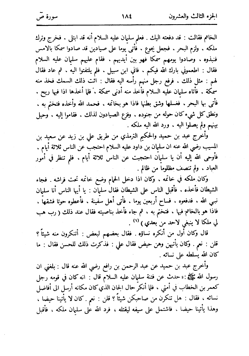 وَكَانَ ملكه فِي خَاتمه وَكَانَ إِذا دخل الْحمام وضع خَاتمه تَحت فرَاشه فجَاء الشَّيْطَان فَأَخذه فَأقبل النَّاس على الشَّيْطَان فَقَالَ سُلَيْمَان: يَا أَيهَا النَّاس أَنا سُلَيْمَان نَبِي الله فدفعوه فساح أَرْبَعِينَ يَوْمًا فَأتى أهل سفينة فَأَعْطوهُ حوتاً فَشَقهَا فَإِذا هُوَ بالخاتم فِيهَا فتختم بِهِ ثمَّ جَاءَ فَأخذ بناصيته فَقَالَ عِنْد ذَلِك (رب هَب لي ملكا لَا يَنْبَغِي لأحد من بعدِي)