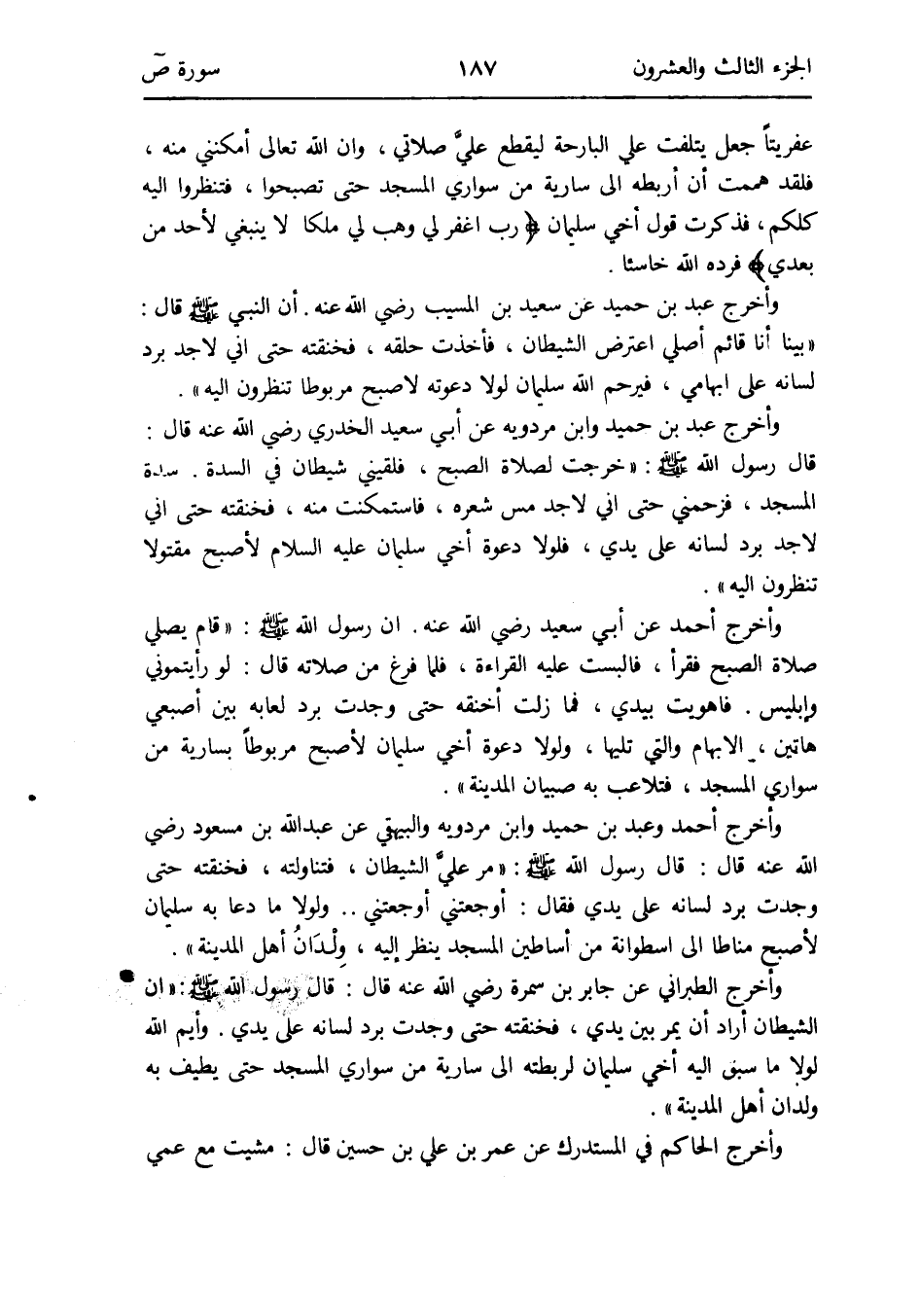 عفريتاً جعل يتلفت عَليّ البارحة ليقطع عليَّ صَلَاتي وَإِن الله تَعَالَى أمكنني مِنْهُ فَلَقَد هَمَمْت أَن أربطه إِلَى سَارِيَة من سواري الْمَسْجِد حَتَّى تصبحوا فتنظروا إِلَيْهِ كلكُمْ فَذكرت قَول أخي سُلَيْمَان {رب اغْفِر لي وهب لي ملكا لَا يَنْبَغِي لأحد من بعدِي} فَرده الله خاسئاً