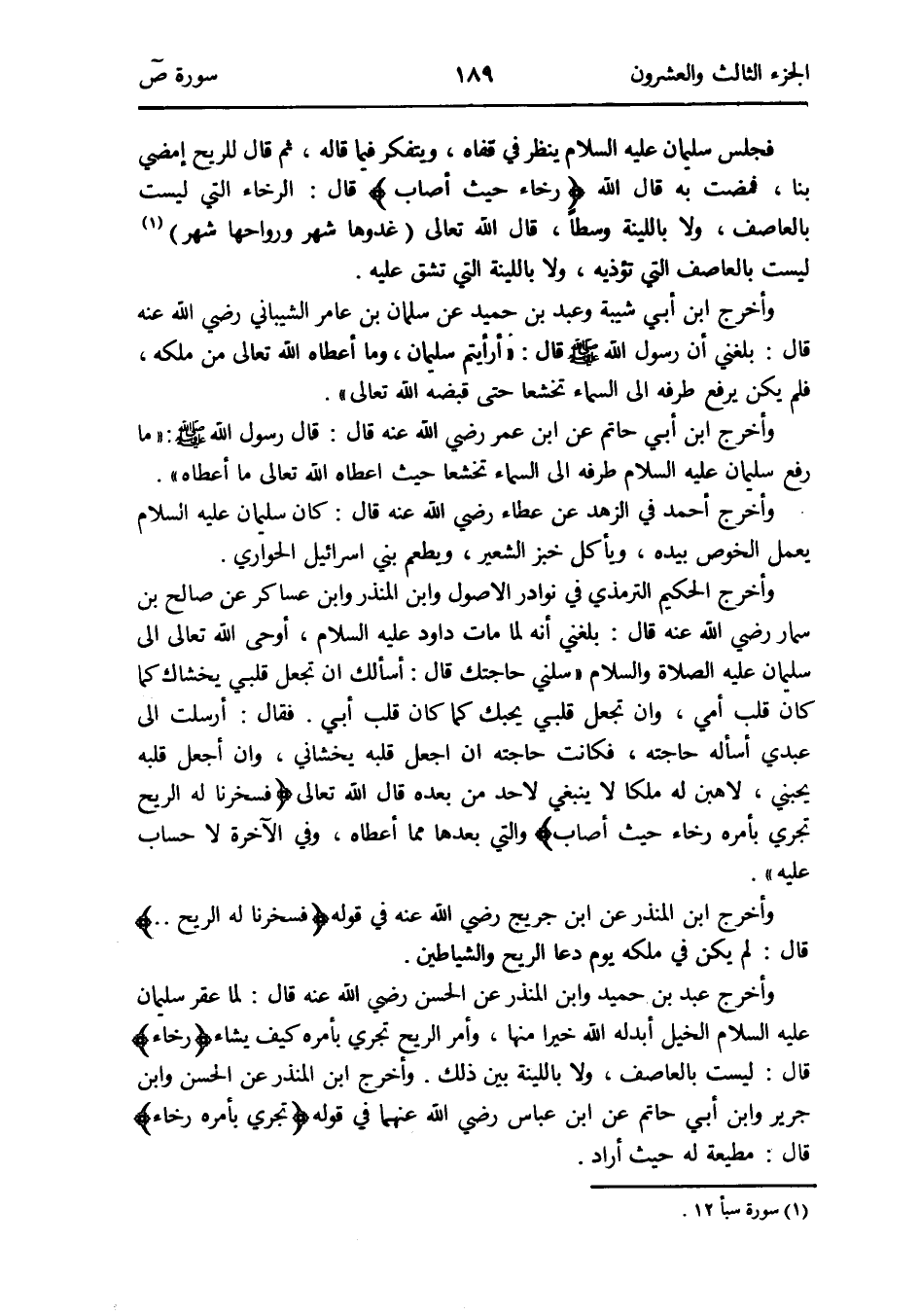 فَجَلَسَ سُلَيْمَان عَلَيْهِ السَّلَام ينظر فِي قَفاهُ ويتفكر فِيمَا قَالَه ثمَّ قَالَ للريح إمضي بِنَا فمضت بِهِ قَالَ الله {رخاء حَيْثُ أصَاب} قَالَ: الرخَاء الَّتِي لَيست بالعاصف وَلَا باللينة وسطا قَالَ الله تَعَالَى (غدوها شهر ورواحها شهر) (سُورَة سبأ 12) لَيست بالعاصف الَّتِي تؤذيه وَلَا باللينة الَّتِي تشق عَلَيْهِ