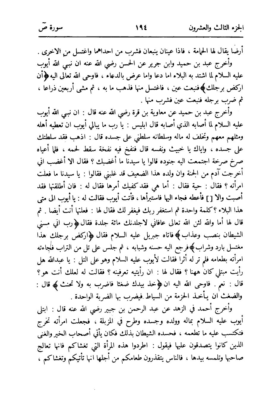 وَأخرج عبد بن حميد عَن مُعَاوِيَة بن قُرَّة رَضِي الله عَنهُ قَالَ: إِن نَبِي الله أَيُّوب عَلَيْهِ السَّلَام لما أَصَابَهُ الَّذِي أَصَابَهُ قَالَ إِبْلِيس: يَا رب مَا يُبَالِي أَيُّوب أَن تعطيه أَهله وَمثلهمْ مَعَهم وتخلف لَهُ مَاله وسلطانه سَلطنِي على جسده قَالَ: اذْهَبْ فقد سلطتك على جسده وَإِيَّاك يَا خَبِيث وَنَفسه قَالَ فَنفخ فِيهِ نفخة سقط لَحْمه فَلَمَّا أعياه صرخَ صرخة اجْتمعت إِلَيْهِ جُنُوده قَالُوا يَا سيدنَا مَا أغضبك فَقَالَ الا أغضب إِنِّي أخرجت آدم من الْجنَّة وَإِن وَلَده هَذَا الضَّعِيف قد غلبني فَقَالُوا: يَا سيدنَا مَا فعلت امْرَأَته فَقَالَ: حَيَّة فَقَالَ: أما هِيَ فقد كفيك أمرهَا فَقَالَ لَهُ: فَإِن أطلقتها فقد أصبت وَإِلَّا [] فأعطه فجَاء إِلَيْهَا فاستبرأها فَأَتَت أَيُّوب فَقَالَت لَهُ: يَا أَيُّوب إِلَى مَتى هَذَا الْبلَاء كلمة وَاحِدَة ثمَّ اسْتغْفر رَبك فَيغْفر لَك فَقَالَ لَهَا: فعلتها أَنْت أَيْضا