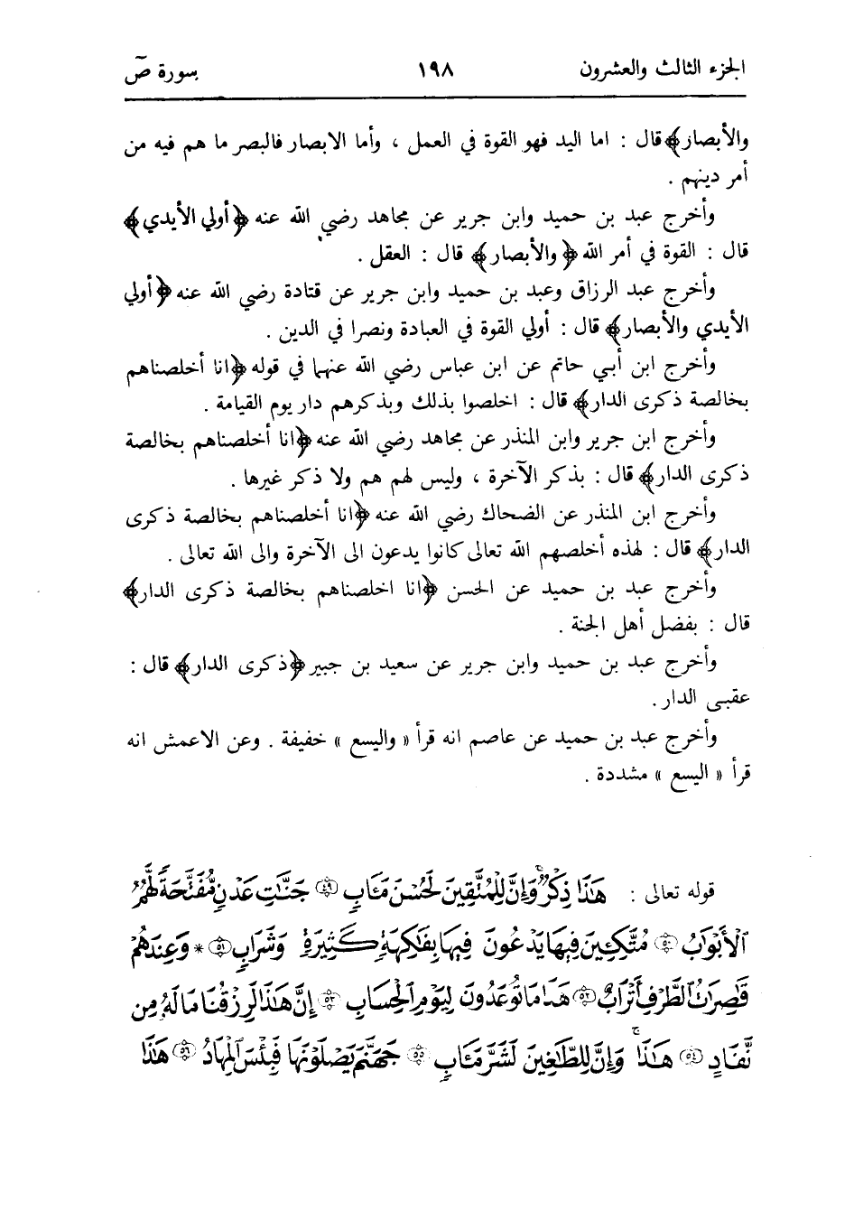 وَأخرج عبد الرَّزَّاق وَعبد بن حميد وَابْن جرير عَن قَتَادَة رَضِي الله عَنهُ {أولي الْأَيْدِي والأبصار} قَالَ: أولي الْقُوَّة فِي الْعِبَادَة ونصراً فِي الدّين