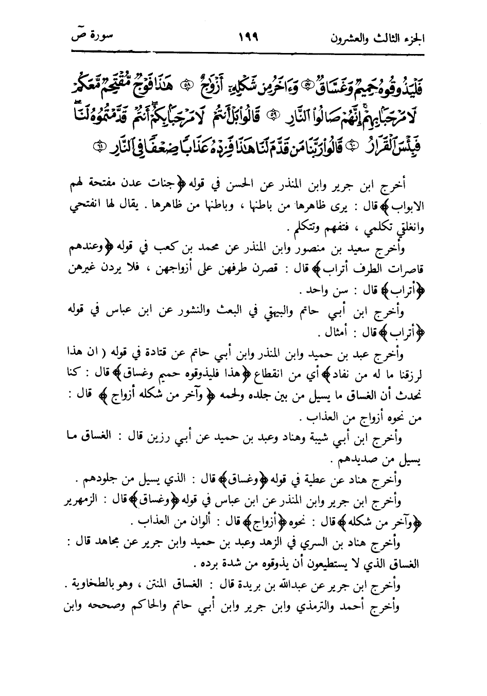 وَأخرج ابْن جرير وَابْن الْمُنْذر عَن ابْن عَبَّاس فِي قَوْله {وغساق} قَالَ: الزَّمْهَرِير {وَآخر من شكله} قَالَ: نَحوه {أَزوَاج} قَالَ: ألوان من الْعَذَاب