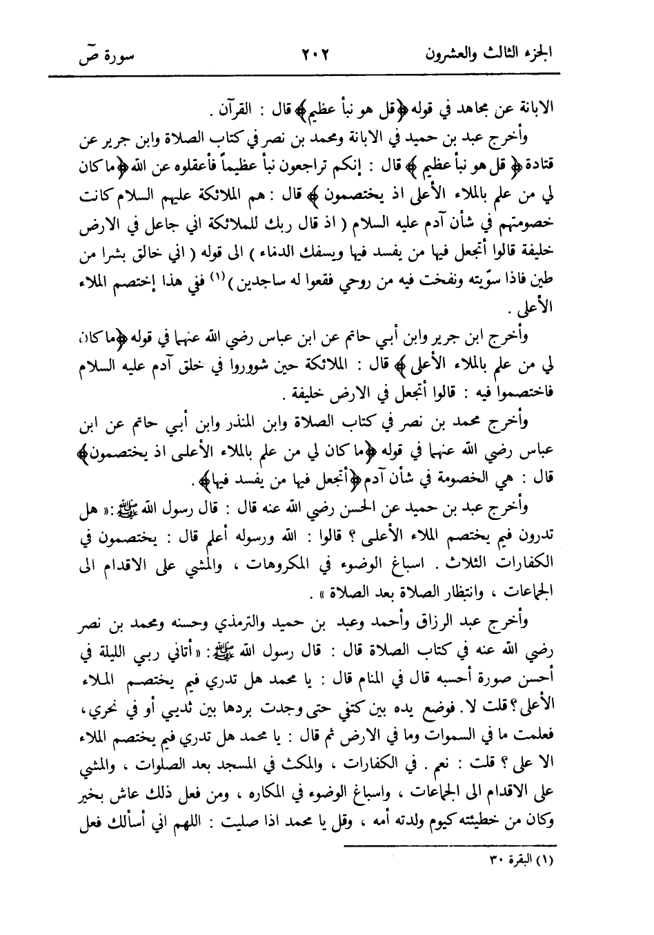 وَأخرج عبد بن حميد فِي الابانة وَمُحَمّد بن نصر فِي كتاب الصَّلَاة وَابْن جرير عَن قَتَادَة {قل هُوَ نبأ عَظِيم} قَالَ: إِنَّكُم تراجعون نبأ عَظِيما فأعقلوه عَن الله {مَا كَانَ لي من علم بالملإِ الْأَعْلَى إِذْ يختصمون} قَالَ: هم الْمَلَائِكَة عَلَيْهِم السَّلَام كَانَت خصومتهم فِي شَأْن آدم عَلَيْهِ السَّلَام (إِذْ قَالَ رَبك للْمَلَائكَة إِنِّي جَاعل فِي الأَرْض خَليفَة قَالُوا أَتجْعَلُ فِيهَا من يفْسد فِيهَا ويسفك المَاء) إِلَى قَوْله (إِنِّي خَالق بشرا من طين فَإِذا سوّيته ونفخت فِيهِ من روحي فقعوا لَهُ ساجدين) (الْبَقَرَة 30) فَفِي هَذَا اخْتصم الْمَلأ الْأَعْلَى
