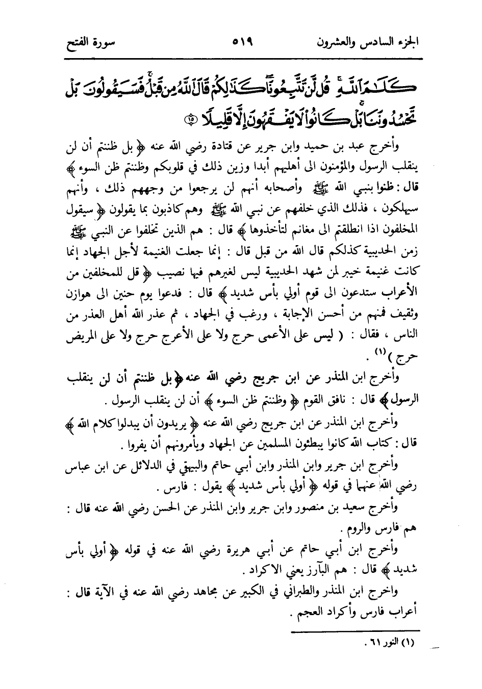 وَأخرج عبد بن حميد وَابْن جرير عَن قَتَادَة رَضِي الله عَنهُ {بل ظننتم أَن لن يَنْقَلِب الرَّسُول والمؤمنون إِلَى أَهْليهمْ أبدا وزين ذَلِك فِي قُلُوبكُمْ وظننتم ظن السوء} قَالَ: ظنُّوا بِنَبِي الله صلى الله عَلَيْهِ وَسلم وَأَصْحَابه أَنهم لن يرجِعوا من وجههم ذَلِك وَأَنَّهُمْ سيهلكون فَذَلِك الَّذِي خَلفهم عَن نَبِي الله صلى الله عَلَيْهِ وَسلم وهم كاذبون بِمَا يَقُولُونَ {سَيَقُولُ الْمُخَلفُونَ إِذا انطلقتم إِلَى مَغَانِم لتأخذوها} قَالَ: هم الَّذين تخلفوا عَن النَّبِي صلى الله عَلَيْهِ وَسلم زمن الْحُدَيْبِيَة كذلكم قَالَ الله من قبل قَالَ: إِنَّمَا جعلت الْغَنِيمَة لأجل الْجِهَاد إِنَّمَا كَانَت غنيمَة خَيْبَر لمن شهد الْحُدَيْبِيَة لَيْسَ لغَيرهم فِيهَا نصيب {قل للمخلفين من الْأَعْرَاب ستدعون إِلَى قوم أولي بَأْس شَدِيد} قَالَ: فدعوا يَوْم حنين إِلَى هوَازن وَثَقِيف فَمنهمْ من أحسن الإِجابة وَرغب فِي الْجِهَاد ثمَّ عذر الله أهل الْعذر من النَّاس فَقَالَ: (لَيْسَ على الْأَعْمَى حرج وَلَا على الْأَعْرَج حرج وَلَا على الْمَرِيض حرج) (النُّور 61)