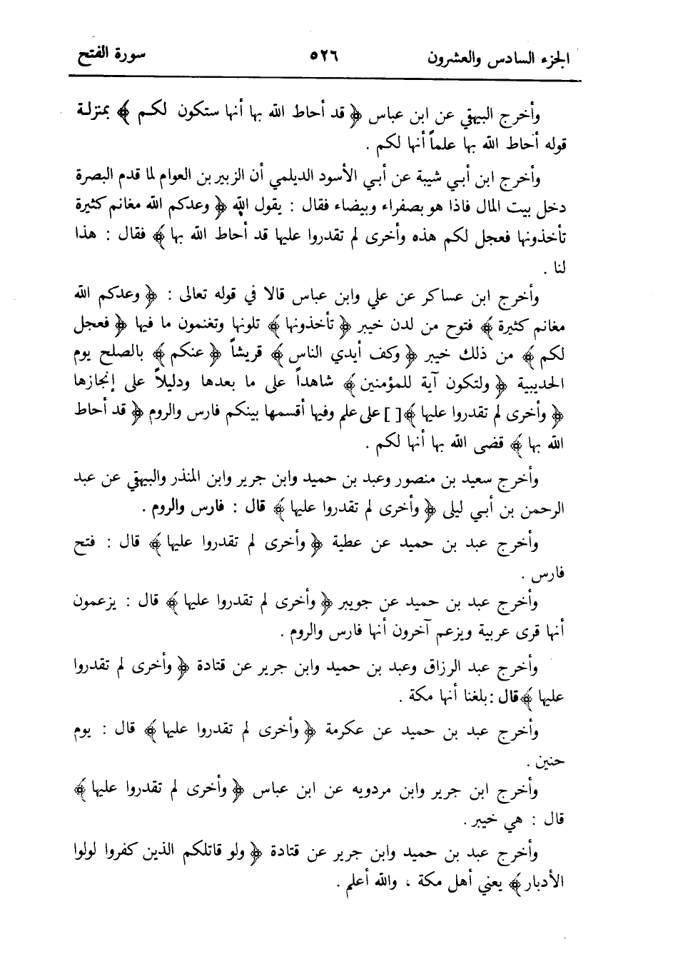وَأخرج ابْن عَسَاكِر عَن عَليّ وَابْن عَبَّاس قَالَا فِي قَوْله تَعَالَى: {وَعدكُم الله مَغَانِم كَثِيرَة} فتوح من لدن خَيْبَر {تأخذونها} تلونها وتغنمون مَا فِيهَا {فَعجل لكم} من ذَلِك خَيْبَر {وكف أَيدي النَّاس} قُريْشًا {عَنْكُم} بِالصُّلْحِ يَوْم الْحُدَيْبِيَة {ولتكون آيَة للْمُؤْمِنين} شَاهدا على مَا بعْدهَا ودليلاً على إنجازها {وَأُخْرَى لم تقدروا عَلَيْهَا} [] على علم وفيهَا أقسمها بَيْنكُم فَارس وَالروم {قد أحَاط الله بهَا} قضى الله بهَا أَنَّهَا لكم