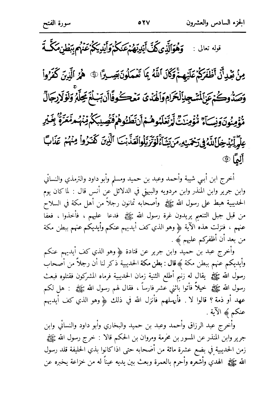 أخرج ابْن أبي شيبَة وَأحمد وَعبد بن حميد وَمُسلم وَأَبُو دَاوُد وَالتِّرْمِذِيّ وَالنَّسَائِيّ وَابْن جرير وَابْن الْمُنْذر وَابْن مرْدَوَيْه وَالْبَيْهَقِيّ فِي الدَّلَائِل عَن أنس قَالَ: لما كَانَ يَوْم الْحُدَيْبِيَة هَبَط على رَسُول الله صلى الله عَلَيْهِ وَسلم وَأَصْحَابه ثَمَانُون رجلا من أهل مَكَّة فِي السِّلَاح من قبل جبل التَّنْعِيم يُرِيدُونَ غرَّة رَسُول الله صلى الله عَلَيْهِ وَسلم فَدَعَا عَلَيْهِم فَأخذُوا فَعَفَا عَنْهُم فَنزلت هَذِه الْآيَة {وَهُوَ الَّذِي كف أَيْديهم عَنْكُم وَأَيْدِيكُمْ عَنْهُم بِبَطن مَكَّة من بعد أَن أَظْفَرَكُم عَلَيْهِم}