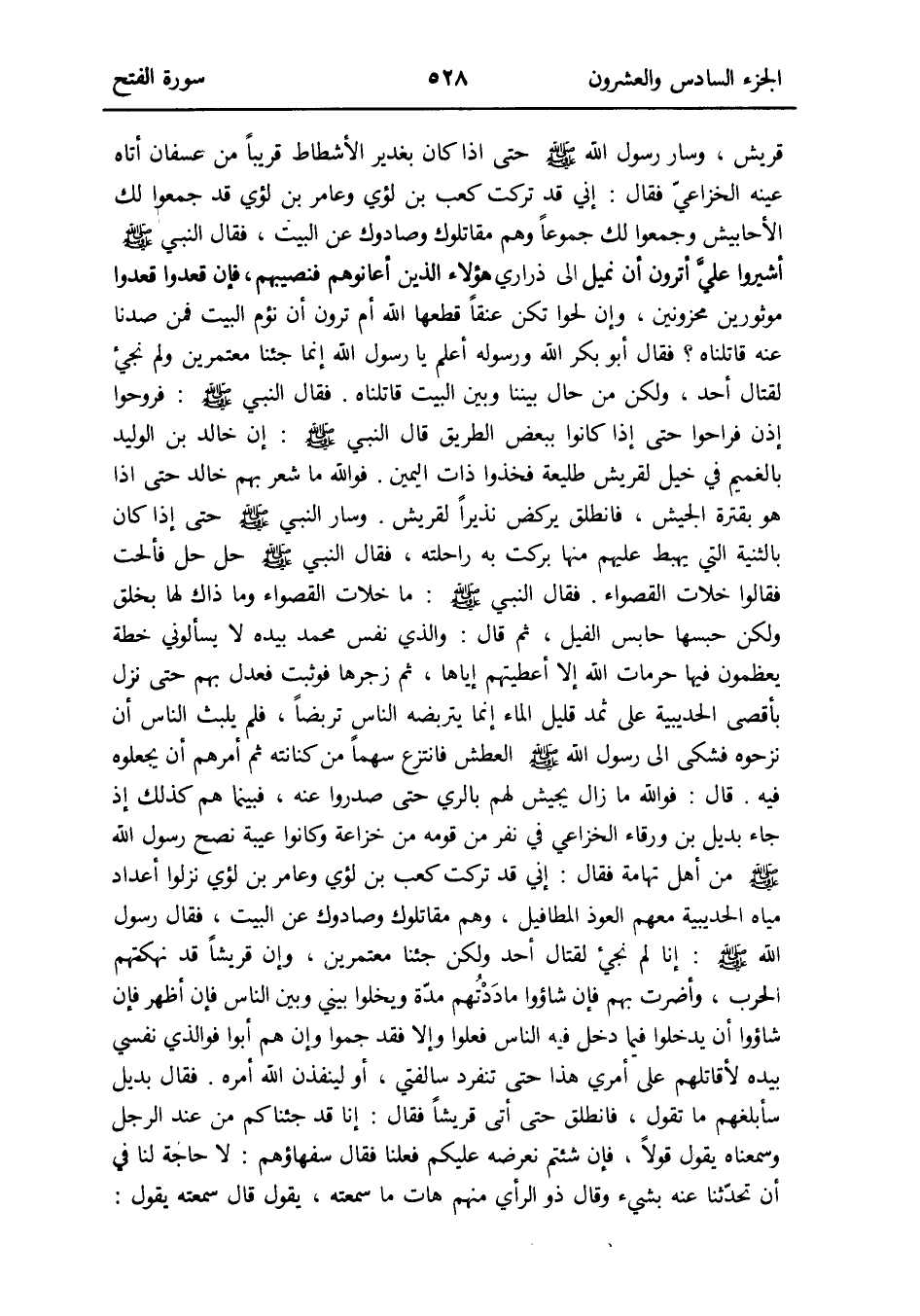 فَبَيْنَمَا هم كَذَلِك إِذْ جَاءَ بديل بن وَرْقَاء الْخُزَاعِيّ فِي نفر من قومه من خُزَاعَة وَكَانُوا عَيْبَة نصح رَسُول الله صلى الله عَلَيْهِ وَسلم من أهل تهَامَة فَقَالَ: إِنِّي قد تركت كَعْب بن لؤَي وعامر بن لؤَي نزلُوا أعداد مياه الْحُدَيْبِيَة مَعَهم العوذ المطافيل وهم مقاتلوك وصادوك عَن البيتز فَقَالَ رَسُول الله صلى الله عَلَيْهِ وَسلم: إِنَّا لم نجيء لقِتَال أحد وَلَكِن جِئْنَا معتمرين وَإِن قُريْشًا قد نهكتهم الْحَرْب وأضرت بهم فَإِن شاؤوا ماددتهم مُدَّة ويخلوا بيني وَبَين النَّاس فَإِن أظهر فَإِن شاؤوا أَن يدخلُوا فِيمَا دخل فِيهِ النَّاس فعلوا وَإِلَّا فقد جموا وَإِن هم أَبَوا فوالذي نَفسِي بِيَدِهِ لأقاتلهم على أَمْرِي هَذَا حَتَّى تنفرد سالفتي أَو لينفذن الله أمره