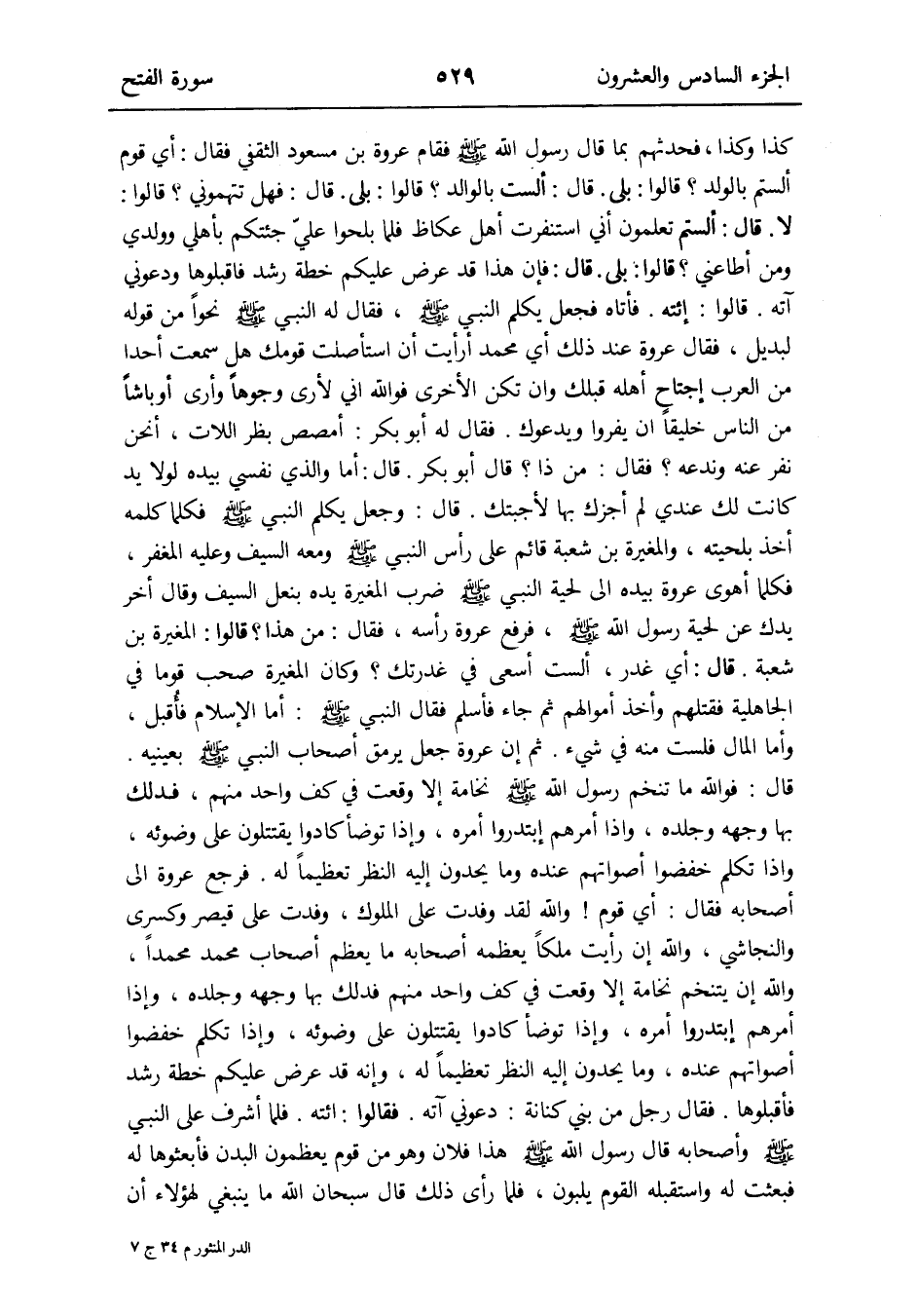 فَأَتَاهُ فَجعل يكلم النَّبِي صلى الله عَلَيْهِ وَسلم فَقَالَ لَهُ النَّبِي صلى الله عَلَيْهِ وَسلم نَحوا من قَوْله لبديلز فَقَالَ عُرْوَة عِنْد ذَلِك: أَي مُحَمَّد أَرَأَيْت إِن استأصلت قَوْمك هَل سَمِعت أحدا من الْعَرَب اجتاح أَهله قبلك وَإِن تكن الْأُخْرَى فوَاللَّه إِنِّي لأرى وُجُوهًا وَأرى أوباشا من النَّاس خليقا أَن يَفروا ويدعوك