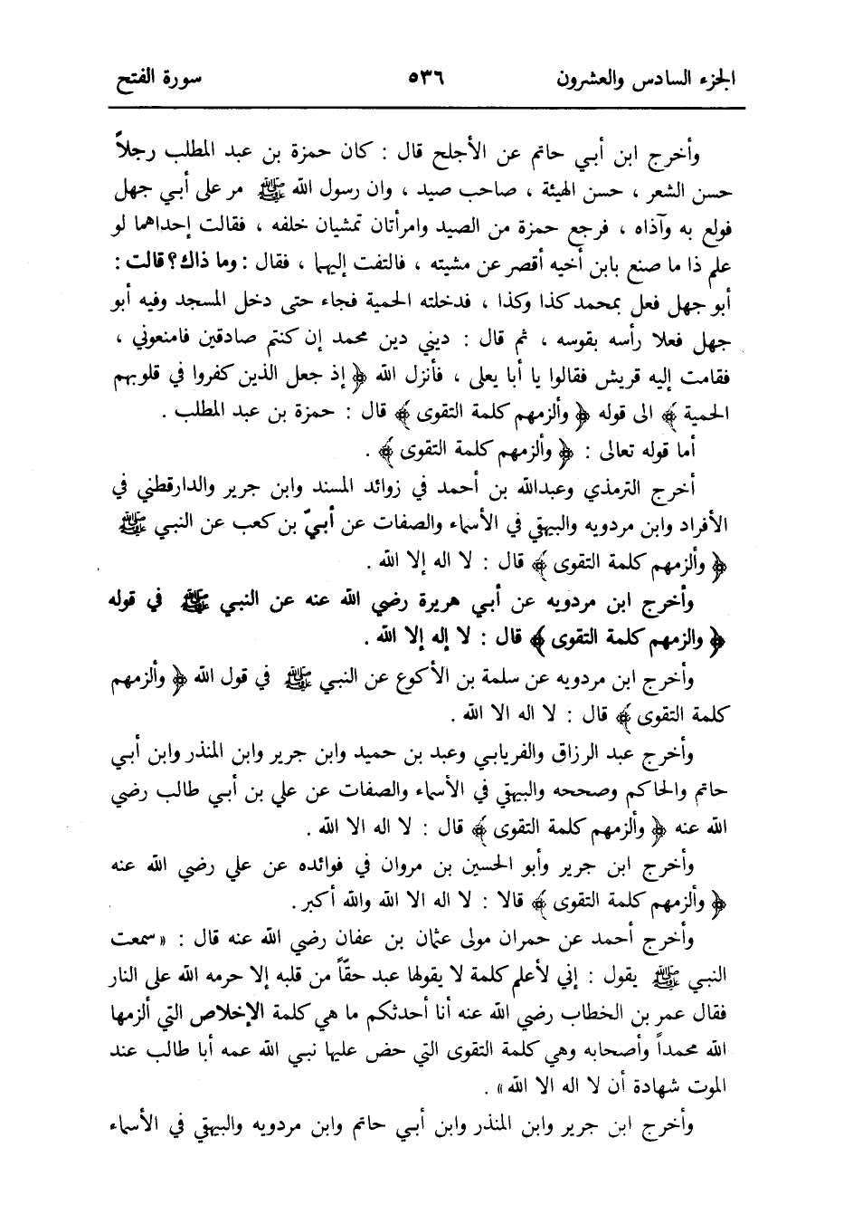أخرج التِّرْمِذِيّ وَعبد الله بن أَحْمد فِي زَوَائِد الْمسند وَابْن جرير وَالدَّارقطني فِي الإِفراد وَابْن مرْدَوَيْه وَالْبَيْهَقِيّ فِي الْأَسْمَاء وَالصِّفَات عَن أبي بن كَعْب عَن النَّبِي صلى الله عَلَيْهِ وَسلم {وألزمهم كلمة التَّقْوَى} قَالَ: لَا إِلَه إِلَّا الله