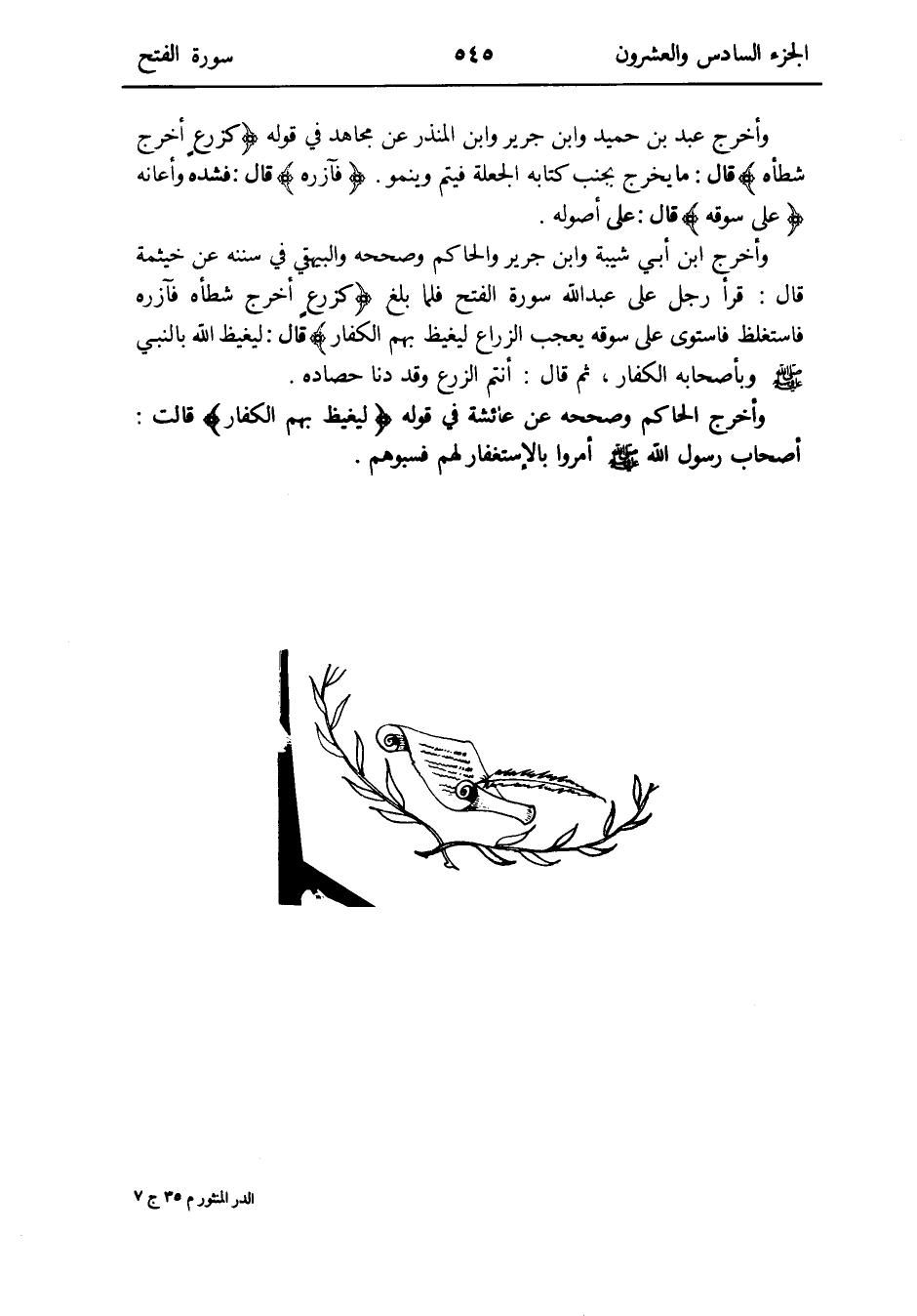 وَأخرج ابْن أبي شيبَة وَابْن جرير وَالْحَاكِم وَصَححهُ وَالْبَيْهَقِيّ فِي سنَنه عَن خَيْثَمَة قَالَ: قَرَأَ رجل على عبد الله سُورَة الْفَتْح فَلَمَّا بلغ {كزرعٍ أخرج شطأه فآزره فاستغلظ فَاسْتَوَى على سوقه يعجب الزراع ليغيظ بهم الْكفَّار} قَالَ: ليغيظ الله بِالنَّبِيِّ صلى الله عَلَيْهِ وَسلم بِأَصْحَابِهِ الْكفَّار ثمَّ قَالَ: أَنْتُم الزَّرْع وَقد دنا حَصَاده