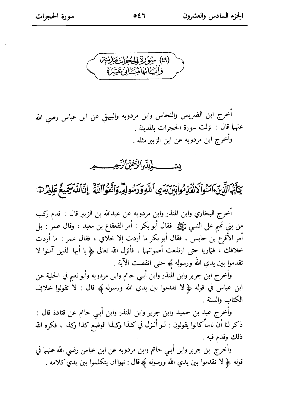وَأخرج ابْن جرير وَابْن أبي حَاتِم وَابْن مرْدَوَيْه عَن ابْن عَبَّاس رَضِي الله عَنْهُمَا فِي قَوْله {لَا تقدمُوا بَين يَدي الله وَرَسُوله} قَالَ: نهوا أَن يتكلموا بَين يَدي كَلَامه