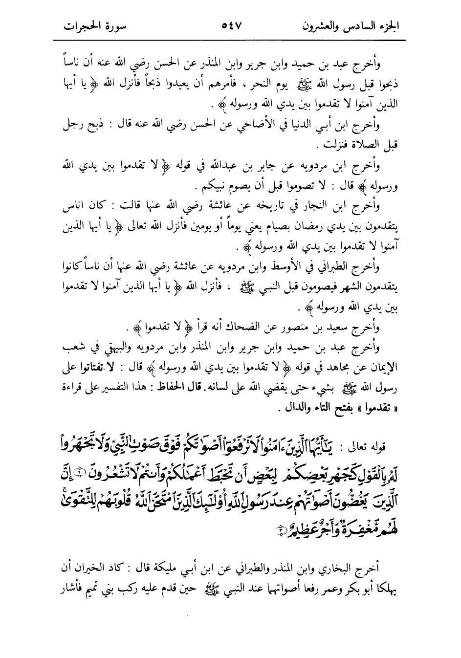 وَأخرج عبد بن حميد وَابْن جرير وَابْن الْمُنْذر عَن الْحسن رَضِي الله عَنهُ أَن نَاسا ذَبَحُوا قبل رَسُول الله صلى الله عَلَيْهِ وَسلم يَوْم النَّحْر فَأَمرهمْ أَن يُعِيدُوا ذبحا فَأنْزل الله {يَا أَيهَا الَّذين آمنُوا لَا تقدمُوا بَين يَدي الله وَرَسُوله}