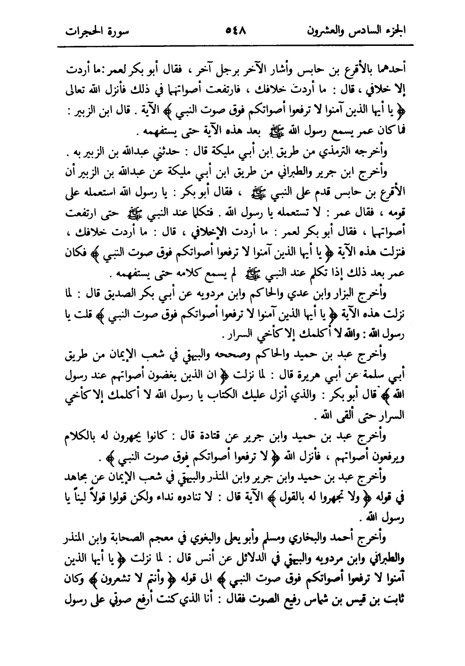 فتكلما عِنْد النَّبِي صلى الله عَلَيْهِ وَسلم حَتَّى ارْتَفَعت أصواتهما فَقَالَ أَبُو بكر لعمر: مَا أردْت إِلَّا خلافي قَالَ: مَا أردْت خِلافك فَنزلت هَذِه الْآيَة {يَا أَيهَا الَّذين آمنُوا لَا تَرفعُوا أَصْوَاتكُم فَوق صَوت النَّبِي} فَكَانَ عمر بعد ذَلِك إِذا تكلم عِنْد النَّبِي صلى الله عَلَيْهِ وَسلم لم يسمع كَلَامه حَتَّى يَسْتَفْهِمهُ