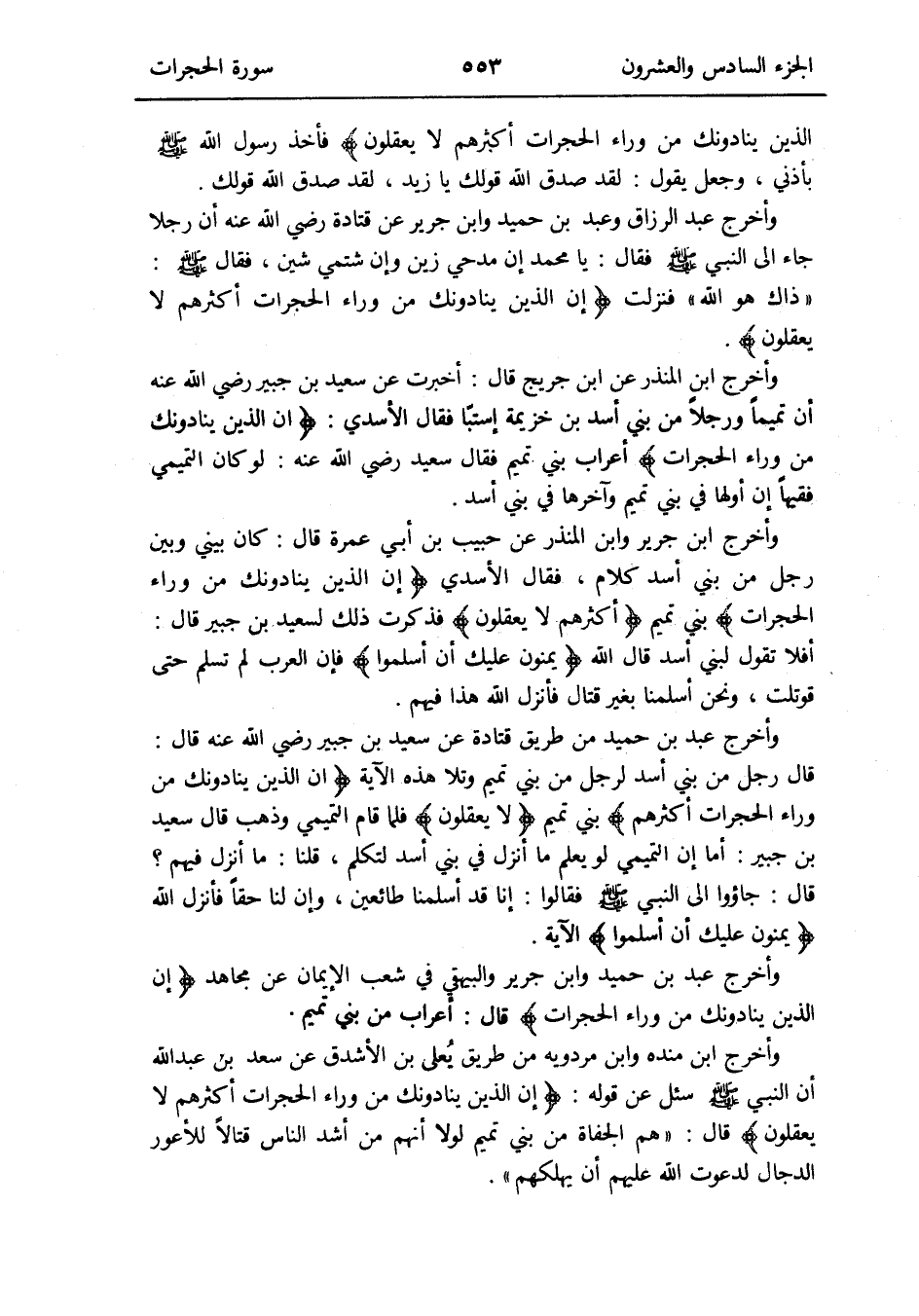 وَأخرج ابْن الْمُنْذر عَن ابْن جريج قَالَ: أخْبرت عَن سعيد بن جُبَير رَضِي الله عَنهُ أَن تميماً ورجلاً من بني أَسد بن خُزَيْمَة إستبّا فَقَالَ الْأَسدي: {إِن الَّذين يُنَادُونَك من وَرَاء الحجرات} أَعْرَاب بني تَمِيم فَقَالَ سعيد رَضِي الله عَنهُ: لَو كَانَ التَّمِيمِي فَقِيها إِن أَولهَا فِي بني تَمِيم وَآخِرهَا فِي بني أَسد