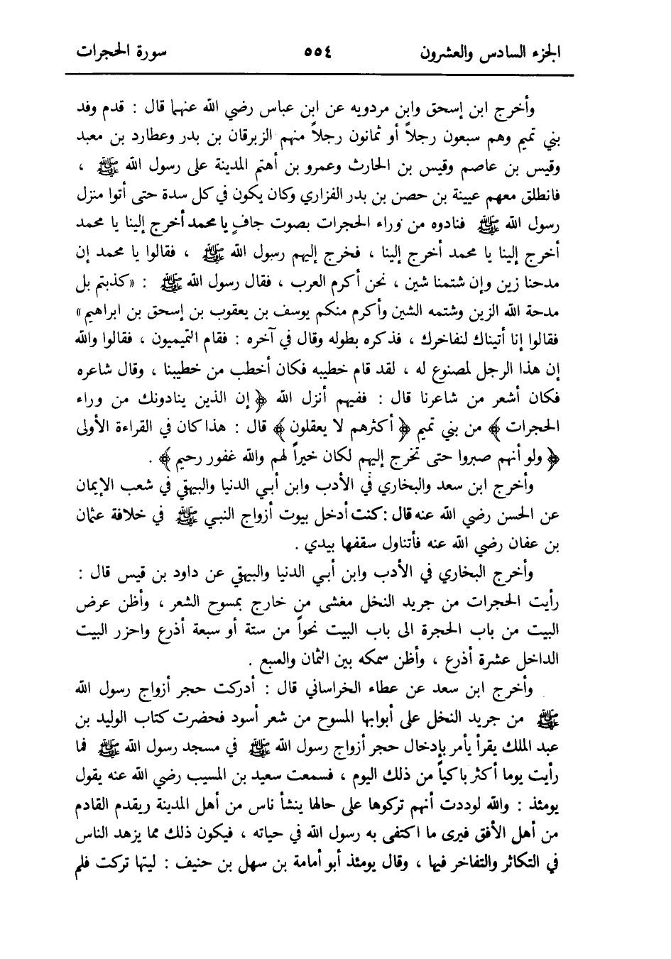 وَأخرج ابْن إِسْحَق وَابْن مرْدَوَيْه عَن ابْن عَبَّاس رَضِي الله عَنْهُمَا قَالَ: قدم وَفد بني تَمِيم وهم سَبْعُونَ رجلا أَو ثَمَانُون رجلا مِنْهُم الزبْرِقَان بن بدر وَعُطَارِد بن معبد وَقيس بن عَاصِم وَقيس بن الْحَارِث وَعَمْرو بن أهتم الْمَدِينَة على رَسُول الله صلى الله عَلَيْهِ وَسلم فَانْطَلق مَعَهم عُيينة بن حصن بن بدر الْفَزارِيّ وَكَانَ يكون فِي كل سدة حَتَّى أَتَوا منزل رَسُول الله صلى الله عَلَيْهِ وَسلم فَنَادَوْهُ من وَرَاء الحجرات بِصَوْت جافٍ: يَا مُحَمَّد أخرج إِلَيْنَا يَا مُحَمَّد أخرج إِلَيْنَا يَا مُحَمَّد أخرج إِلَيْنَا فَخرج إِلَيْهِم رَسُول الله صلى الله عَلَيْهِ وَسلم فَقَالُوا: يَا مُحَمَّد إِن مَدْحنَا زين وَإِن شَتمنَا شين نَحن أكْرم الْعَرَب فَقَالَ رَسُول الله صلى الله عَلَيْهِ وَسلم: كَذبْتُمْ بل مِدْحَة الله الزين وَشَتمه الشين وَأكْرم مِنْكُم يُوسُف بن يَعْقُوب بن إِسْحَق بن إِبْرَاهِيم فَقَالُوا: إِنَّا أَتَيْنَاك لِنُفَاخِرَك فَذكره بِطُولِهِ وَقَالَ فِي آخِره: فَقَامَ التَّمِيمِيُّونَ فَقَالُوا: وَالله إِن هَذَا الرجل لمصنوع لَهُ لقد قَامَ خَطِيبه فَكَانَ أَخطب من خَطِيبنَا وَقَالَ شاعره فَكَانَ أشعر من شَاعِرنَا قَالَ: ففيهم أنزل الله {إِن الَّذين يُنَادُونَك من وَرَاء الحجرات} من بني تَمِيم {أَكْثَرهم لَا يعْقلُونَ} قَالَ: هَذَا كَانَ فِي الْقِرَاءَة الأولى {وَلَو أَنهم صَبَرُوا حَتَّى تخرج إِلَيْهِم لَكَانَ خيرا لَهُم وَالله غَفُور رَحِيم}
