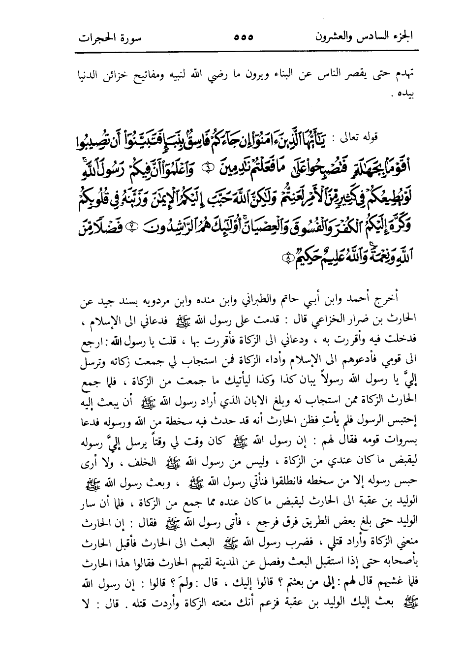 أخرج أَحْمد وَابْن أبي حَاتِم وَالطَّبَرَانِيّ وَابْن مَنْدَه وَابْن مرْدَوَيْه بِسَنَد جيد عَن الْحَارِث بن ضرار الْخُزَاعِيّ قَالَ: قدمت على رَسُول الله صلى الله عَلَيْهِ وَسلم فدعاني إِلَى الإِسلام فَدخلت فِيهِ وأقررت بِهِ وَدَعَانِي إِلَى الزَّكَاة فأقررت بهَا قلت يَا رَسُول الله: ارْجع إِلَى قومِي فَأَدْعُوهُمْ إِلَى الإِسلام وَأَدَاء الزَّكَاة فَمن اسْتَجَابَ لي جمعت زَكَاته وَترسل إليَّ يَا رَسُول الله رَسُولا يبان كَذَا وَكَذَا ليأتيك مَا جمعت من الزَّكَاة فَلَمَّا جمع الْحَارِث الزَّكَاة مِمَّن اسْتَجَابَ لَهُ وَبلغ الابان الَّذِي أَرَادَ رَسُول الله صلى الله عَلَيْهِ وَسلم أَن يبْعَث إِلَيْهِ إحتبس الرَّسُول فَلم يأتِ فَظن الْحَارِث أَنه قد حدث فِيهِ سخطَة من الله وَرَسُوله فَدَعَا بِسَرَوَاتِ قومه فَقَالَ لَهُم: إِن رَسُول الله صلى الله عَلَيْهِ وَسلم كَانَ وَقت لي وقتا يُرْسل إليَّ رَسُوله ليقْبض مَا كَانَ عِنْدِي من الزَّكَاة وَلَيْسَ من رَسُول الله صلى الله عَلَيْهِ وَسلم الْخلف وَلَا أرى حبس رَسُوله إِلَّا من سخطه فَانْطَلقُوا فنأتي رَسُول الله صلى الله عَلَيْهِ وَسلم وَبعث رَسُول الله صلى الله عَلَيْهِ وَسلم الْوَلِيد بن عقبَة إِلَى الْحَارِث ليقْبض مَا كَانَ عِنْده مِمَّا جمع من الزَّكَاة فَلَمَّا أَن سَار الْوَلِيد حَتَّى بلغ بعض الطَّرِيق فرق فَرجع فَأتى رَسُول الله صلى الله عَلَيْهِ وَسلم فَقَالَ: إِن الْحَارِث مَنَعَنِي الزَّكَاة وَأَرَادَ قَتْلِي فَضرب رَسُول الله صلى الله عَلَيْهِ وَسلم الْبَعْث إِلَى الْحَارِث فَأقبل الْحَارِث بِأَصْحَابِهِ حَتَّى إِذا اسْتقْبل الْبَعْث وَفصل عَن الْمَدِينَة لَقِيَهُمْ الْحَارِث فَقَالُوا: هَذَا الْحَارِث فَلَمَّا غشيهم قَالَ لَهُم: إِلَى من بعثتم قَالُوا: إِلَيْك قَالَ: وَلم قَالُوا: أَن رَسُول الله صلى الله عَلَيْهِ وَسلم بعث إِلَيْك الْوَلِيد بن عقبَة فَزعم أَنَّك منعته الزَّكَاة وَأَرَدْت قَتله