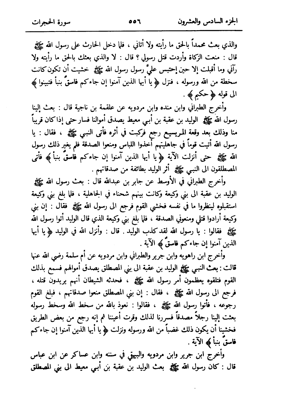 وَأخرج ابْن جرير وَابْن مرْدَوَيْه وَالْبَيْهَقِيّ فِي سنَنه وَابْن عَسَاكِر عَن ابْن عَبَّاس قَالَ: كَانَ رَسُول الله صلى الله عَلَيْهِ وَسلم بعث الْوَلِيد بن عقبَة بن أبي معيط إِلَى بني المصطلق