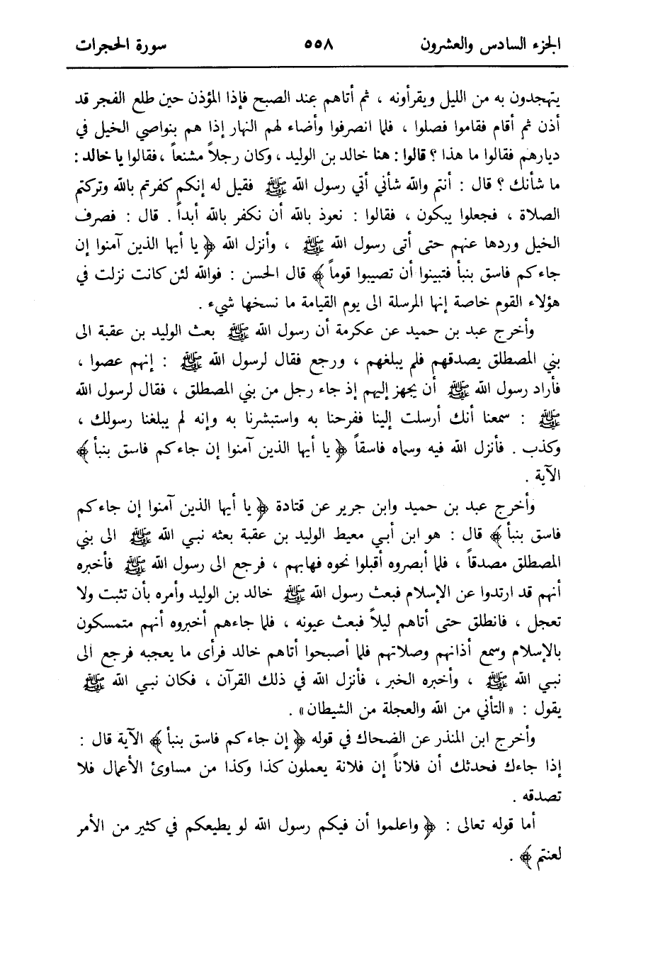 وَأخرج عبد بن حميد وَابْن جرير عَن قَتَادَة {يَا أَيهَا الَّذين آمنُوا إِن جَاءَكُم فَاسق بنبإ} قَالَ: هُوَ ابْن أبي معيط الْوَلِيد بن عقبَة بَعثه نَبِي الله صلى الله عَلَيْهِ وَسلم إِلَى بني المصطلق مُصدقا فَلَمَّا أبصروه أَقبلُوا نَحوه فهابهم فَرجع إِلَى رَسُول الله صلى الله عَلَيْهِ وَسلم فَأخْبرهُ أَنهم قد ارْتَدُّوا عَن الْإِسْلَام فَبعث رَسُول الله صلى الله عَلَيْهِ وَسلم خَالِد بن الْوَلِيد وَأمره بِأَن تثبت وَلَا تعجل فَانْطَلق حَتَّى أَتَاهُم لَيْلًا فَبعث عيونه فَلَمَّا جَاءَهُم أَخْبرُوهُ أَنهم متمسكون بالإِسلام وَسمع أذانهم وصلاتهم فَلَمَّا أَصْبحُوا أَتَاهُم خَالِد فَرَأى مَا يُعجبهُ فَرجع إِلَى نَبِي الله صلى الله عَلَيْهِ وَسلم وَأخْبرهُ الْخَبَر فَأنْزل الله فِي ذَلِك الْقُرْآن فَكَانَ نَبِي الله صلى الله عَلَيْهِ وَسلم يَقُول: التأني من الله والعجلة من الشَّيْطَان