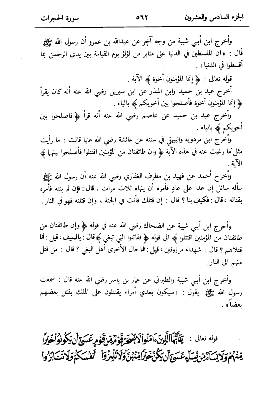 وَأخرج ابْن مرْدَوَيْه وَالْبَيْهَقِيّ فِي سنَنه عَن عَائِشَة رَضِي الله عَنْهَا قَالَت: مَا رَأَيْت مثل مَا رغبت عَنهُ فِي هَذِه الْآيَة {وَإِن طَائِفَتَانِ من الْمُؤمنِينَ اقْتَتَلُوا فأصلحوا بَينهمَا} الْآيَة