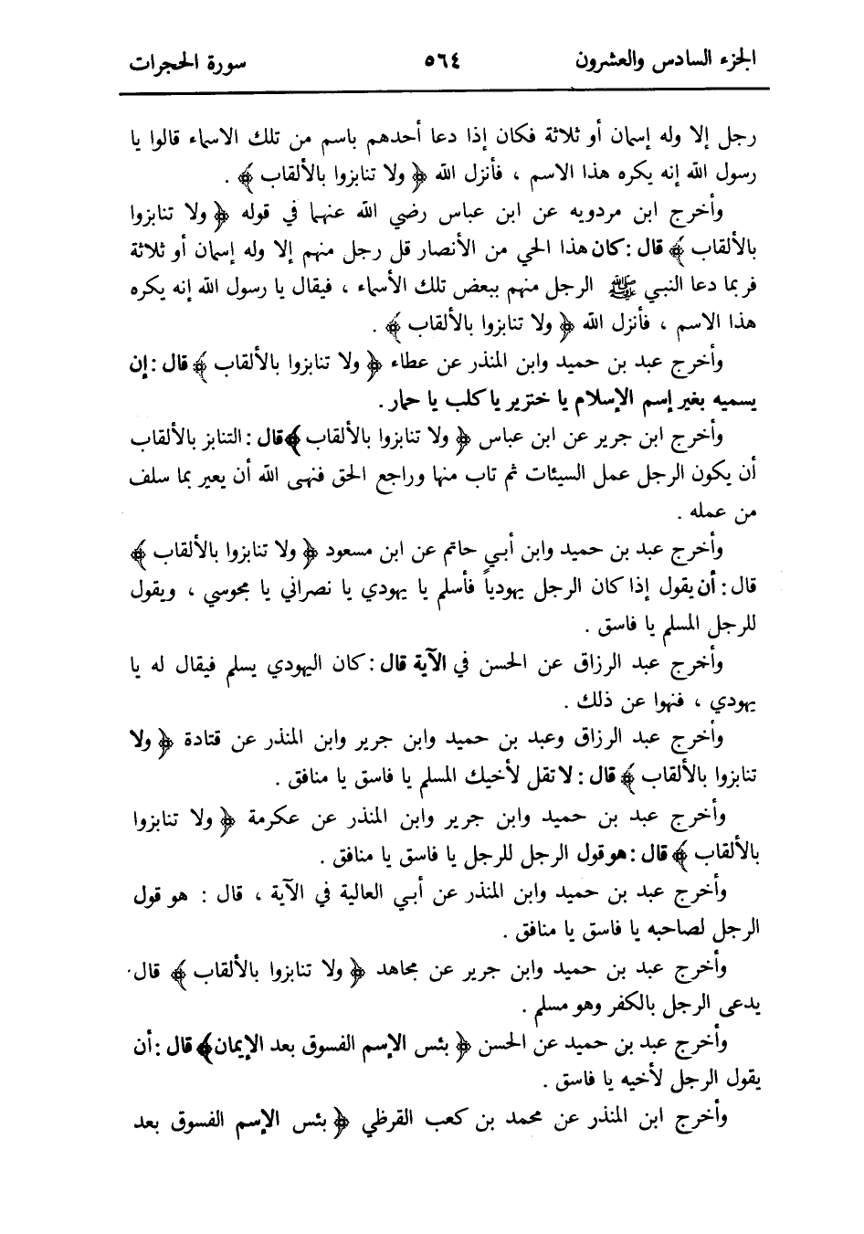 وَأخرج عبد بن حميد وَابْن جرير وَابْن الْمُنْذر عَن عِكْرِمَة {وَلَا تنابزوا بِالْأَلْقَابِ} قَالَ: هُوَ قَول الرجل للرجل يَا فَاسق يَا مُنَافِق