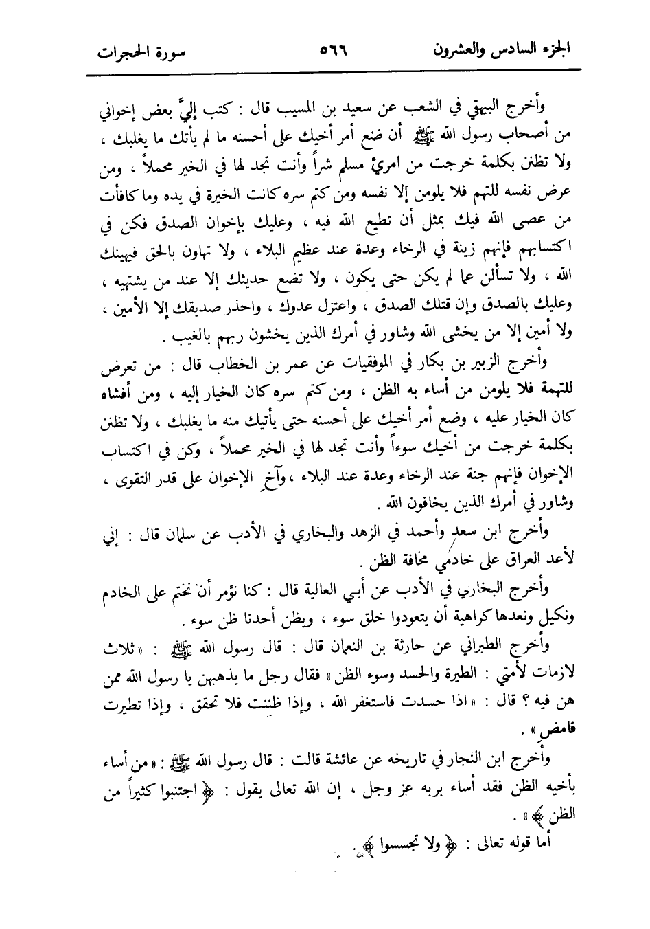 وَأخرج الْبَيْهَقِيّ فِي الشّعب عَن سعيد بن الْمسيب قَالَ: كتب إليَّ بعض إخْوَانِي من أَصْحَاب رَسُول الله صلى الله عَلَيْهِ وَسلم أَن ضع أَمر أَخِيك على أحْسنه مَا لم يأتك مَا يَغْلِبك وَلَا تَظنن بِكَلِمَة خرجت من امرىء مُسلم شرا وَأَنت تَجِد لَهَا فِي الْخَيْر محملًا وَمن عرض نَفسه للتهم فَلَا يَلُومن إِلَّا نَفسه وَمن كتم سره كَانَت الْخيرَة فِي يَده وَمَا كافأت من عصى الله فِيك بِمثل أَن تطيع الله فِيهِ وَعَلَيْك بِإِخْوَان الصدْق فَكُن فِي اكتسابهم فَإِنَّهُم زِينَة فِي الرخَاء وعدة عِنْد عَظِيم الْبلَاء وَلَا تهاون بِالْحَقِّ فيهينك الله وَلَا تسألن عَمَّا لم يكن حَتَّى يكون وَلَا تضع حَدِيثك إِلَّا عِنْد من يشتهيه وَعَلَيْك بِالصّدقِ وَإِن قَتلك الصدْق وَاعْتَزل عَدوك وَاحْذَرْ صديقك إِلَّا الْأمين وَلَا أَمِين إِلَّا من يخْشَى الله وشاور فِي أَمرك الَّذين يَخْشونَ رَبهم بِالْغَيْبِ